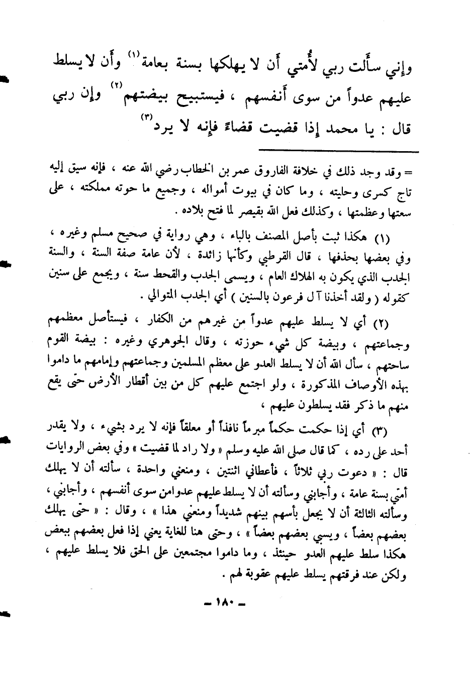 وإني سألت ربي لأمتي أن لا يهلكها بسنة بعامة (1) ، وأن لا يسلط عليهم عدوا من سوى أنفسهم، فيستبيح بيضتهم (2) ، وإن ربي قال: يا محمد إذا قضيت قضاء فإنه لا يرد (3) ،