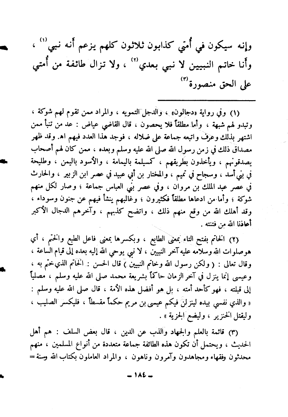 وإنه سيكون في أمتي كذابون ثلاثون كلهم يزعم أنه نبي (1) ، وأنا خاتم النبيين لا نبي بعدي (2) ، ولا تزال طائفة من أمتي على الحق منصورة (3)