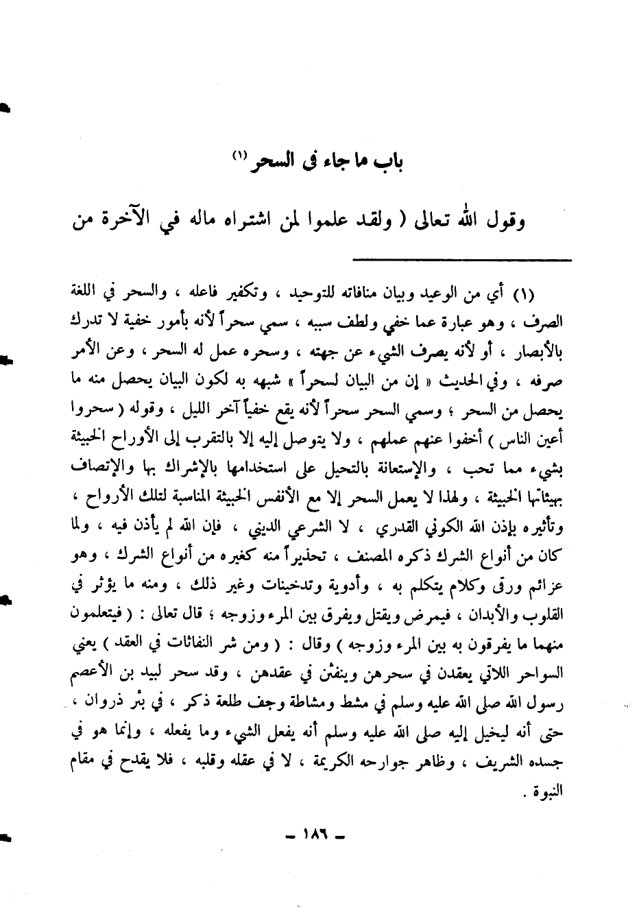 (1) أي من الوعيد وبيان منافاته للتوحيد، وتكفير فاعله. والسحر في اللغة: الصرف، وهو عبارة عما خفي ولطف سببه، سمي سحرا لأنه بأمور خفية لا تدرك بالأبصار، أو لأنه يصرف الشيء عن جهته، وسحره عمل له السحر، وعن الأمر صرفه. وفي الحديث: " إن من البيان لسحرا "1 شبهه به لكون البيان يحصل منه ما يحصل من السحر، وسمي السحر سحرا لأنه يقع خفيا آخر الليل، وقوله: (سحروا أعين الناس) أخفوا عنهم عملهم، ولا يتوصل إليه إلا بالتقرب إلى الأرواح الخبيثة بشيء مما تحب، والاستعانة بالتحيل على استخدامها بالإشراك بها والاتصاف بهيئاتها الخبيثة، ولهذا لا يعمل السحر إلا مع الأنفس الخبيثة المناسبة لتلك الأرواح، وتأثيره بإذن الله الكوني القدري لا الشرعي الديني، فإن الله لم يأذن فيه. ولما كان من أنواع الشرك ذكره المصنف تحذيرا منه كغيره من أنواع الشرك، وهو عزائم ورقى وكلام يتكلم به، وأدوية وتدخينات وغير ذلك، ومنه ما يؤثر في القلوب والأبدان، فيمرض ويقتل ويفرق بين المرء وزوجه.