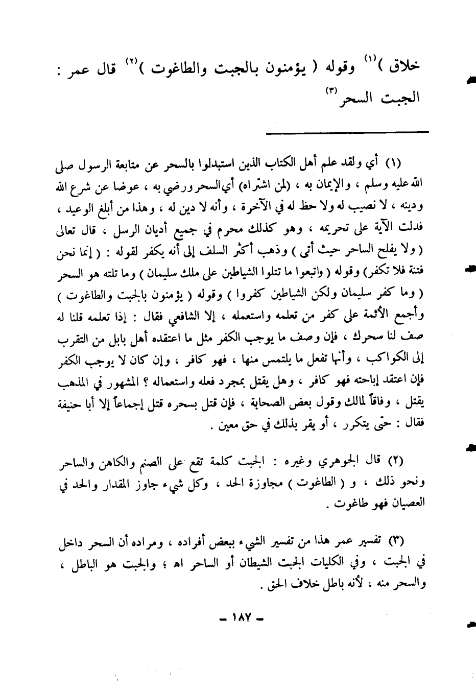 (3) تفسير عمر هذا من تفسير الشيء ببعض أفراده، ومراده أن السحر داخل في الجبت، وفي الكليات: ((الجبت الشيطان أو الساحر)) . اهـ، والجبت هو الباطل، والسحر منه؛ لأنه باطل خلاف الحق.