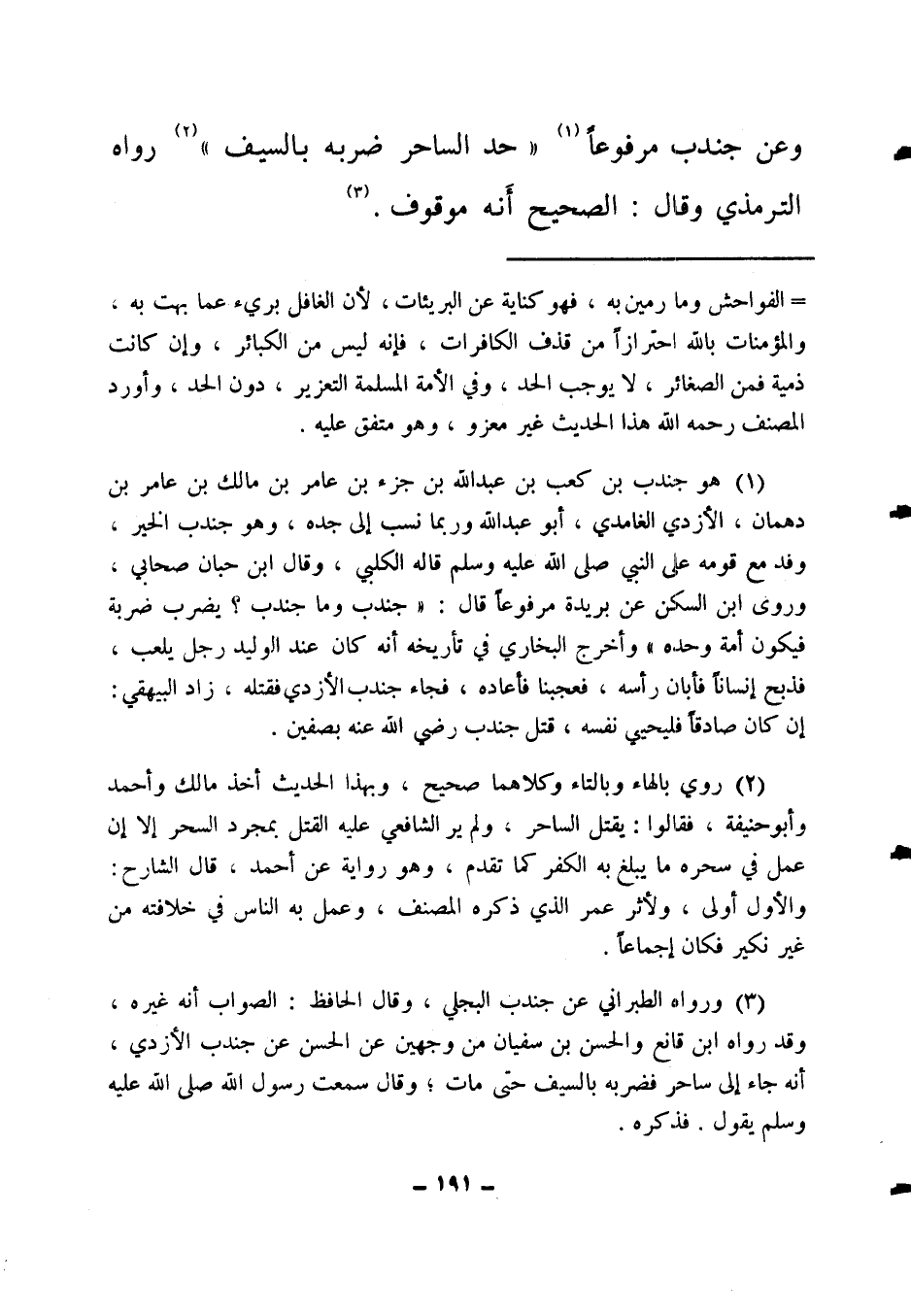 وعن جندب مرفوعا: (1) " حد الساحر ضربة بالسيف " 1 (2) . رواه الترمذي وقال: (الصحيح أنه موقوف) (3) .