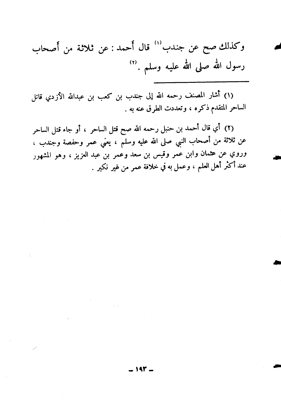 (2) أي قال أحمد بن حنبل -رحمه الله-: صح قتل الساحر أو جاء قتل الساحر عن ثلاثة من أصحاب النبي صلى الله عليه وسلم يعني عمر وحفصة وجندب. وروي عن عثمان وابن عمر وقيس بن سعد وعمر بن عبد العزيز، وهو المشهور عند أكثر أهل العلم، وعمل به في خلافة عمر من غير نكير.