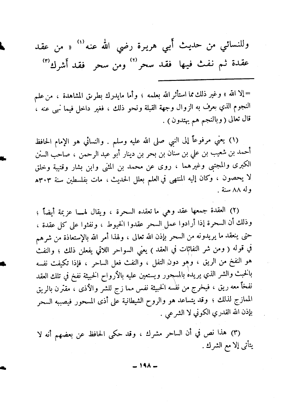 وللنسائي من حديث أبي هريرة رضي الله عنه (1) : " من عقد عقدة ثم نفث فيها فقد سحر، ومن سحر (2) فقد أشرك (3) ،