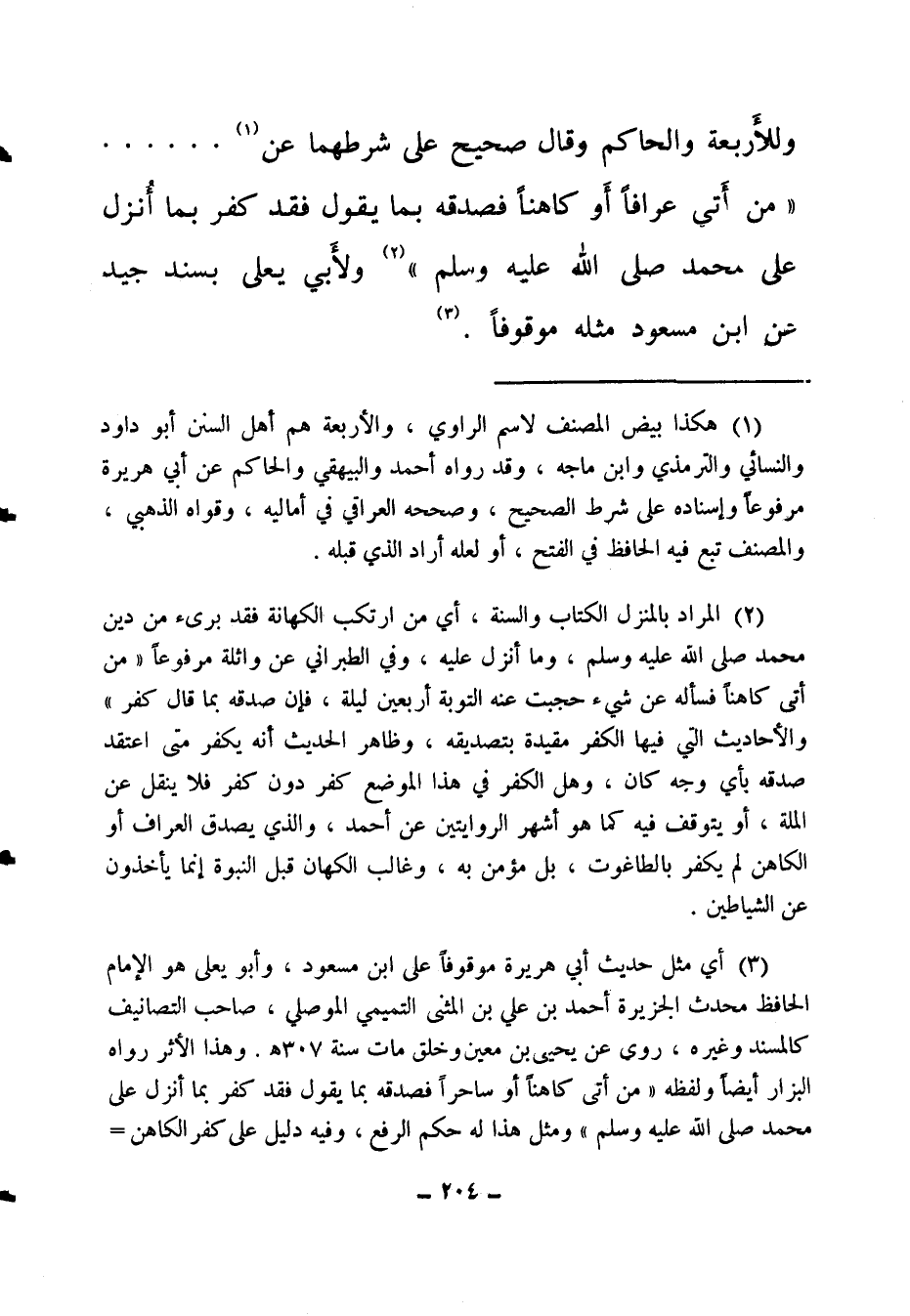 (3) أي مثل حديث أبي هريرة موقوفا على ابن مسعود، وأبو يعلى هو الإمام الحافظ محدث الجزيرة أحمد بن علي بن المثني التميمي الموصلي، صاحب التصانيف كالمسند وغيره، روى عن يحيى بن معين وخلق، مات سنة 307هـ. وهذا الأثر رواه البزار أيضا، ولفظه: " من أتى كاهنا أو ساحرا فصدقه بما يقول فقد كفر بما أنزل على محمد صلى الله عليه وسلم " 2. ومثل هذا له حكم الرفع، وفيه دليل على كفر الكاهن =