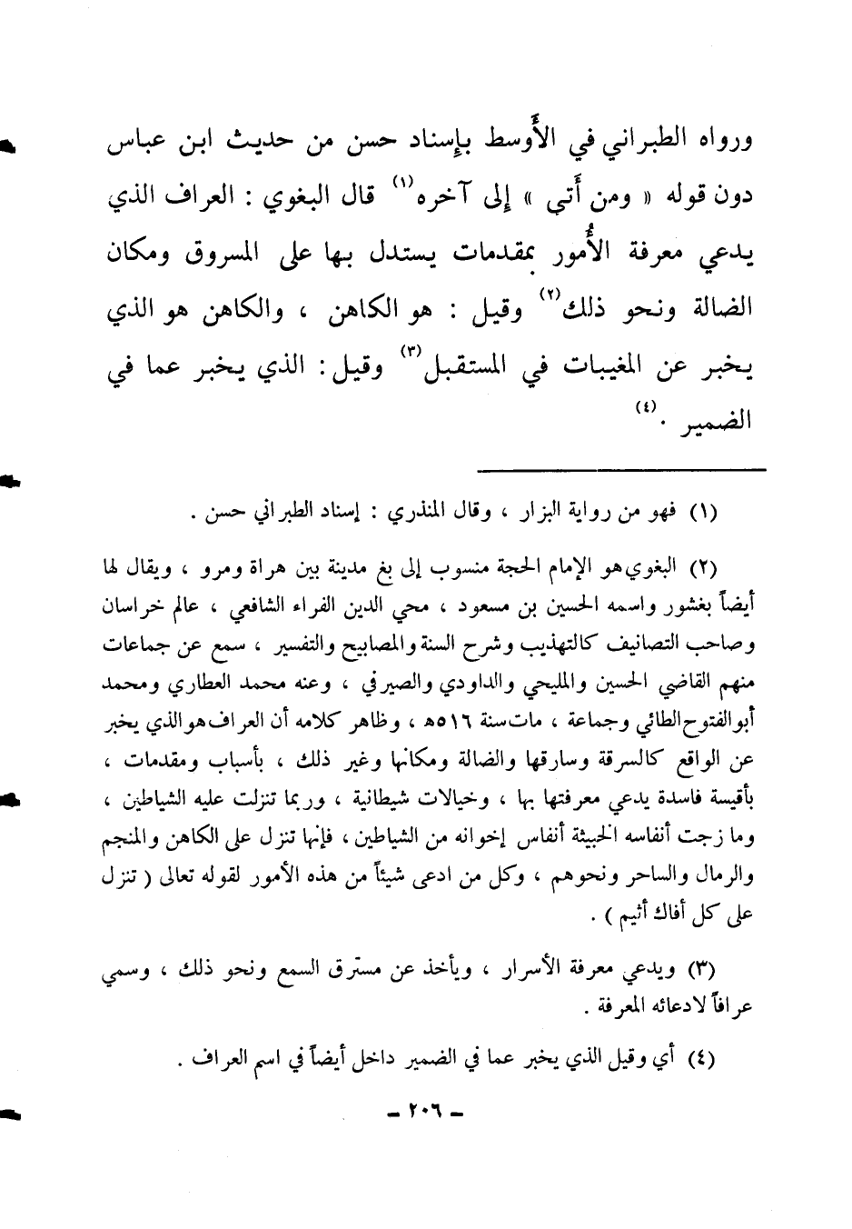 (2) البغوي هو الإمام الحجة منسوب إلى بغ مدينة بين هراة ومرو، ويقال لها أيضا: بغشور. واسمه الحسين بن مسعود، محي الدين الفراء الشافعي، عالم خراسان وصاحب التصانيف كالتهذيب وشرح السنة والمصابيح والتفسير، سمع عن جماعات منهم القاضي الحسين والمليحي والداودي والصيرفي، وعنه محمد العطاري ومحمد أبو الفتوح الطائي وجماعة، مات سنة 516هـ. وظاهر كلامه أن العراف هو الذي يخبر عن الواقع كالسرقة وسارقها والضالة ومكانها وغير ذلك بأسباب ومقدمات، بأقيسة فاسدة يدعي معرفتها بها، وخيالات شيطانية، وربما تنزلت عليه الشياطين، وما زجت أنفاسه الخبيثة أنفاس إخوانه من الشياطين، فإنها تنزل على الكاهن والمنجم والرمال والساحر ونحوهم، وكل من ادعى شيئا من هذه الأمور لقوله تعالى: {تَنَزَّلُ عَلَى كُلِّ أَفَّاكٍ أَثِيمٍ} 1.