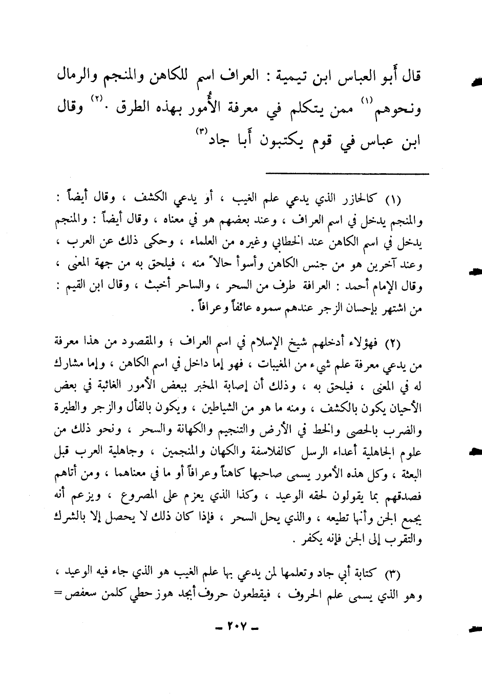 (3) كتابة أبي جاد وتعلمها لمن يدعي بها علم الغيب هو الذي جاء فيه الوعيد، وهو الذي يسمى علم الحروف، فيقطون حروف أبجد هوز حطي كلمن سعفص =