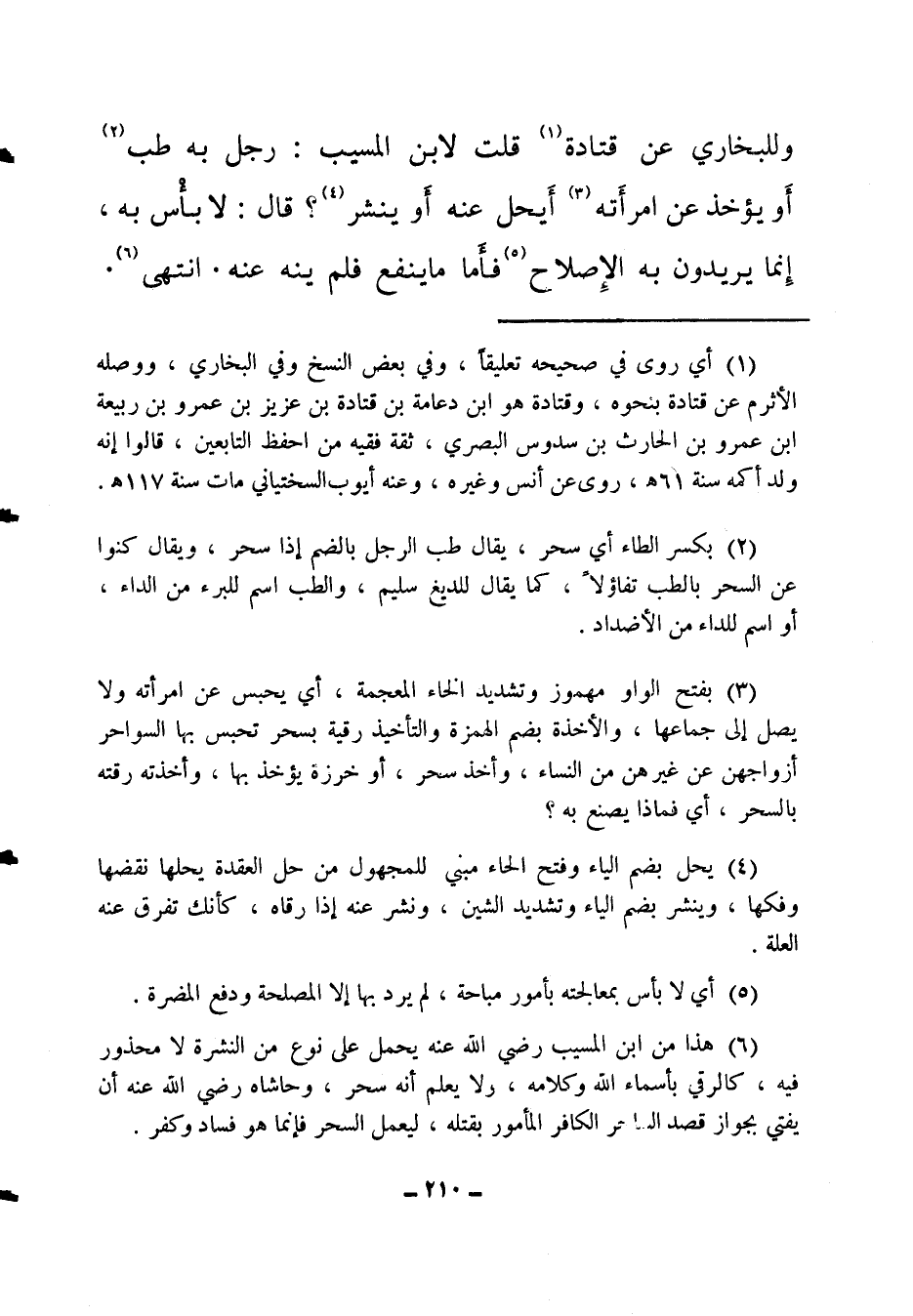 (6) هذا من ابن المسيب رضي الله عنه يحمل على نوع من النشرة لا محذور فيه، كالرقى بأسماء الله وكلامه، ولا يعلم أنه سحر، وحاشاه رضي الله عنه أن يفتي بجواز قصد الساحر الكافر المأمور بقتله ليعمل السحر، فإنما هو فساد وكفر.