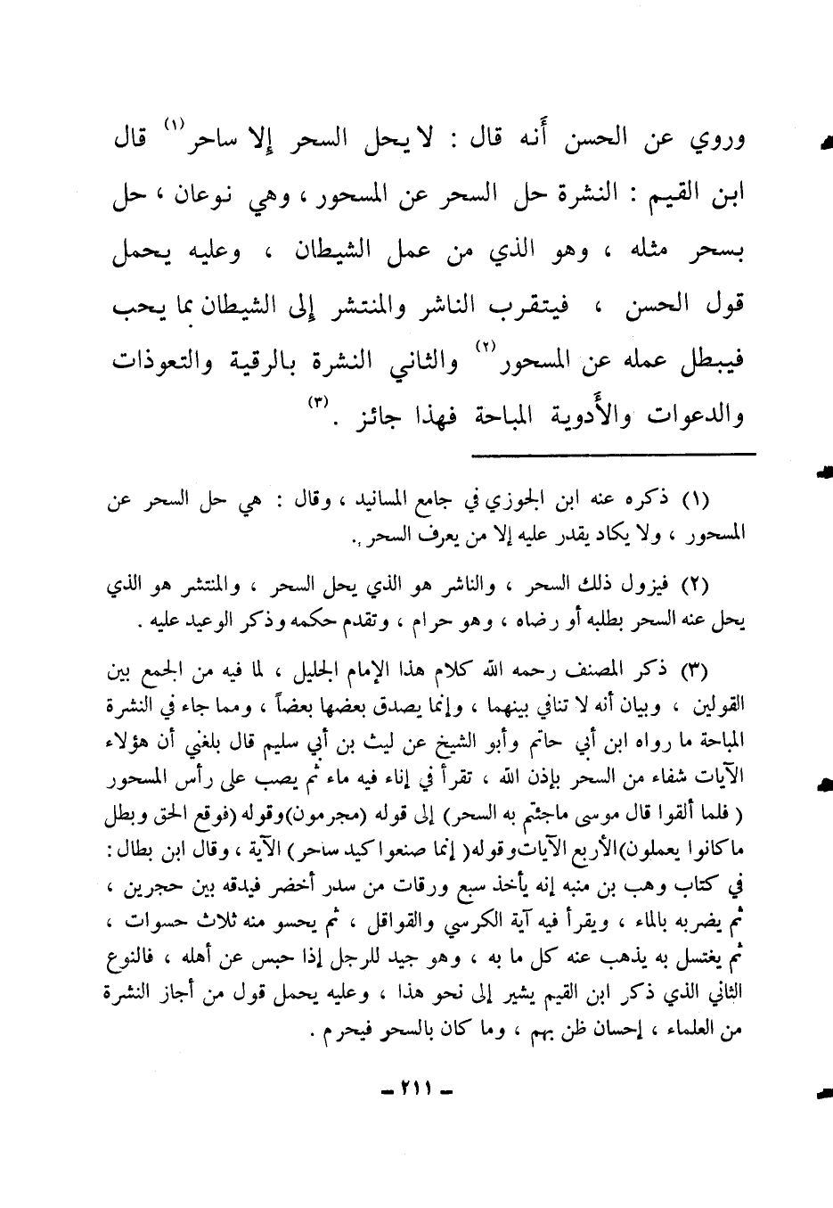 (3) ذكر المصنف -رحمه الله- كلام هذا الإمام الجليل، لما فيه من الجمع بين القولين، وبيان أنه لا تنافي بينهما، وإنما يصدق بعضها بعضا، ومما جاء في النشرة المباحة ما رواه ابن أبي حاتم وأبو الشيخ عن ليث بن أبي سليم قال: بلغني أن هؤلاء الآيات شفاء من السحر بإذن الله، تقرأ في إناء فيه ماء ثم يصب على رأس المسحور: {فَلَمَّا أَلْقَوْا قَالَ مُوسَى مَا جِئْتُمْ بِهِ السِّحْرُ} 1 إلى قوله: {مجرمون} 2، وقوله: {فَوَقَعَ الْحَقُّ وَبَطَلَ مَا كَانُوا يَعْمَلُونَ} 3. الأربع الآيات، وقوله: {إِنَّمَا صَنَعُوا كَيْدُ سَاحِرٍ} 4 الآية. وقال ابن بطال: في كتاب وهب بن منبه إنه يأخذ سبع ورقات من سدر أخضر فيدقه بين حجرين، ثم يضربه بالماء، ويقرأ فيه آية الكرسي والقواقل، ثم يحسو منه ثلاث حسوات، ثم يغتسل به يذهب عنه كل ما به، وهو جيد للرجل إذا حبس عن أهله، فالنوع الثاني الذي ذكر ابن القيم يشير إلى نحو هذا، وعليه يحمل قول من أجاز النشرة من العلماء، إحسان ظن بهم، وما كان بالسحر فيحرم.
