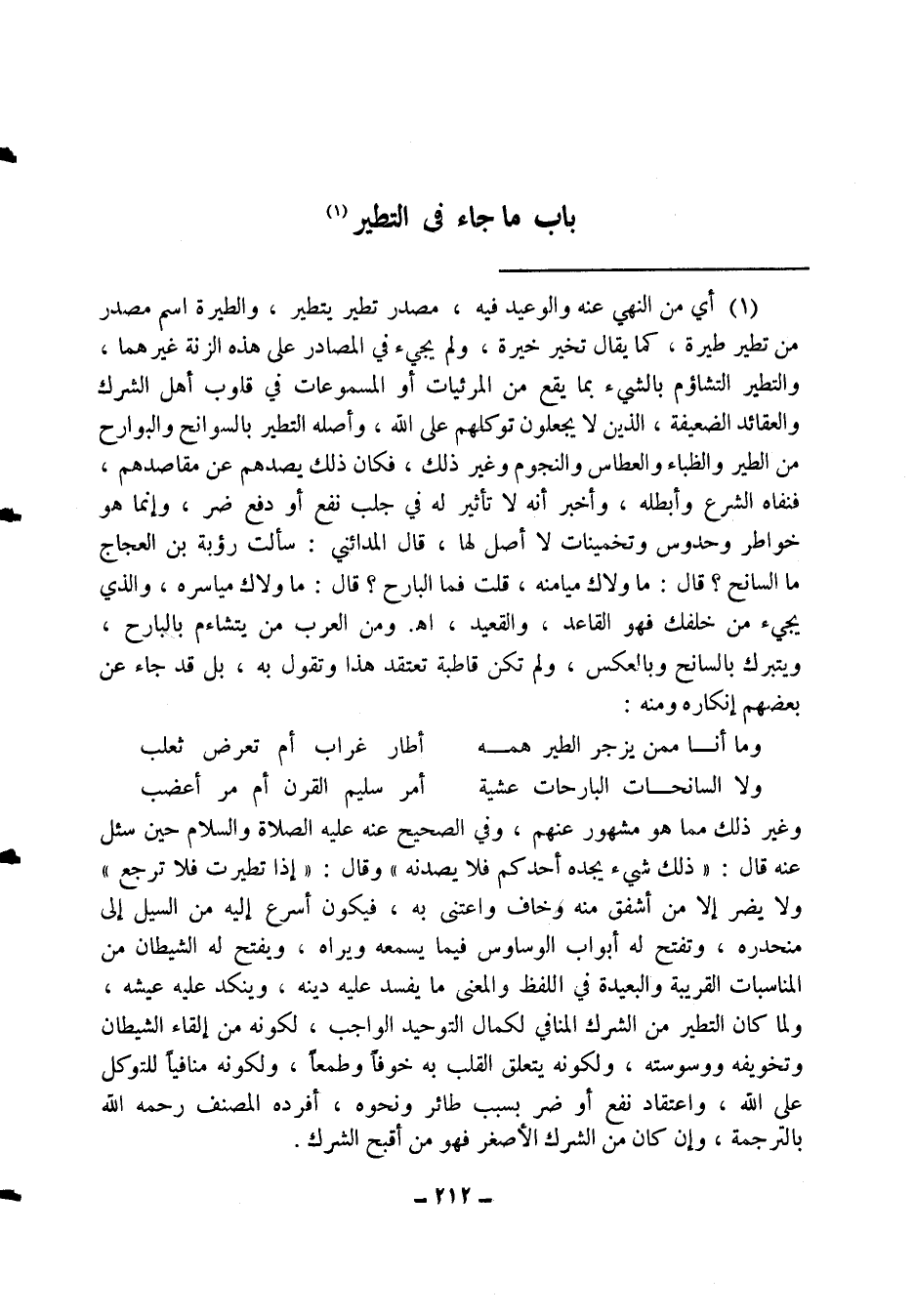 (1) أي من النهي عنه والوعيد فيه، مصدر تطير يتطير، والطيرة اسم مصدر من تطير طيرة، كما يقال تخير خيرة، ولم يجيء في المصادر على هذه الزنة غيرهما، والتطير التشاؤم بالشيء بما يقع من المرئيات أو المسموعات في قلوب أهل الشرك والعقائد الضعيفة، الذين لا يجعلون توكلهم على الله، وأصله التطير بالسوانح والبوارح من الطير والظباء والعطاس والنجوم وغير ذلك، فكان ذلك يصدهم عن مقاصدهم، فنفاه الشرع وأبطله، وأخبر أنه لا تأثير له في جلب نفع أو دفع ضر، وإنما هو خواطر وحدوس وتخمينات لا أصل لها. قال المدائني: ((سألت رؤبة بن العجاج ما السانح؟ قال: ما ولاك ميامنه، قلت: فما البارح؟ قال: ما ولاك مياسره، والذي يجيء من خلفك فهو القاعد والقعيد)) . اهـ.