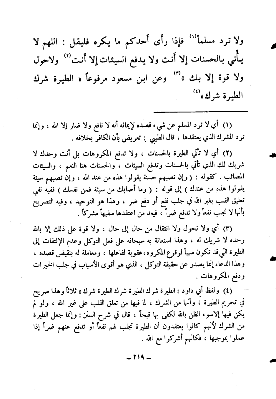 (3) أي ولا تحول ولا انتقال من حال إلى حال، ولا قوة على ذلك إلا بالله وحده لا شريك له، وهذا استعانة به سبحانه على فعل التوكل وعدم الالتفات إلى الطيرة التي قد تكون سببا لوقوع المكروه عقوبة لفاعلها، ومعاملة له بنقيض قصده، وهذا الدعاء إنما يصدر عن حقيقة التوكل الذي هو أقوى الأسباب في جلب الخيرات ودفع المكروهات.