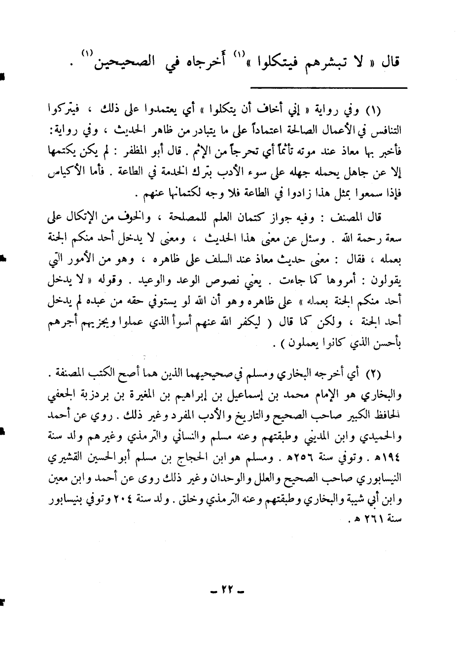 قال: لا تبشرهم فيتكلوا " 1 (1) أخرجاه في الصحيحين (2) .