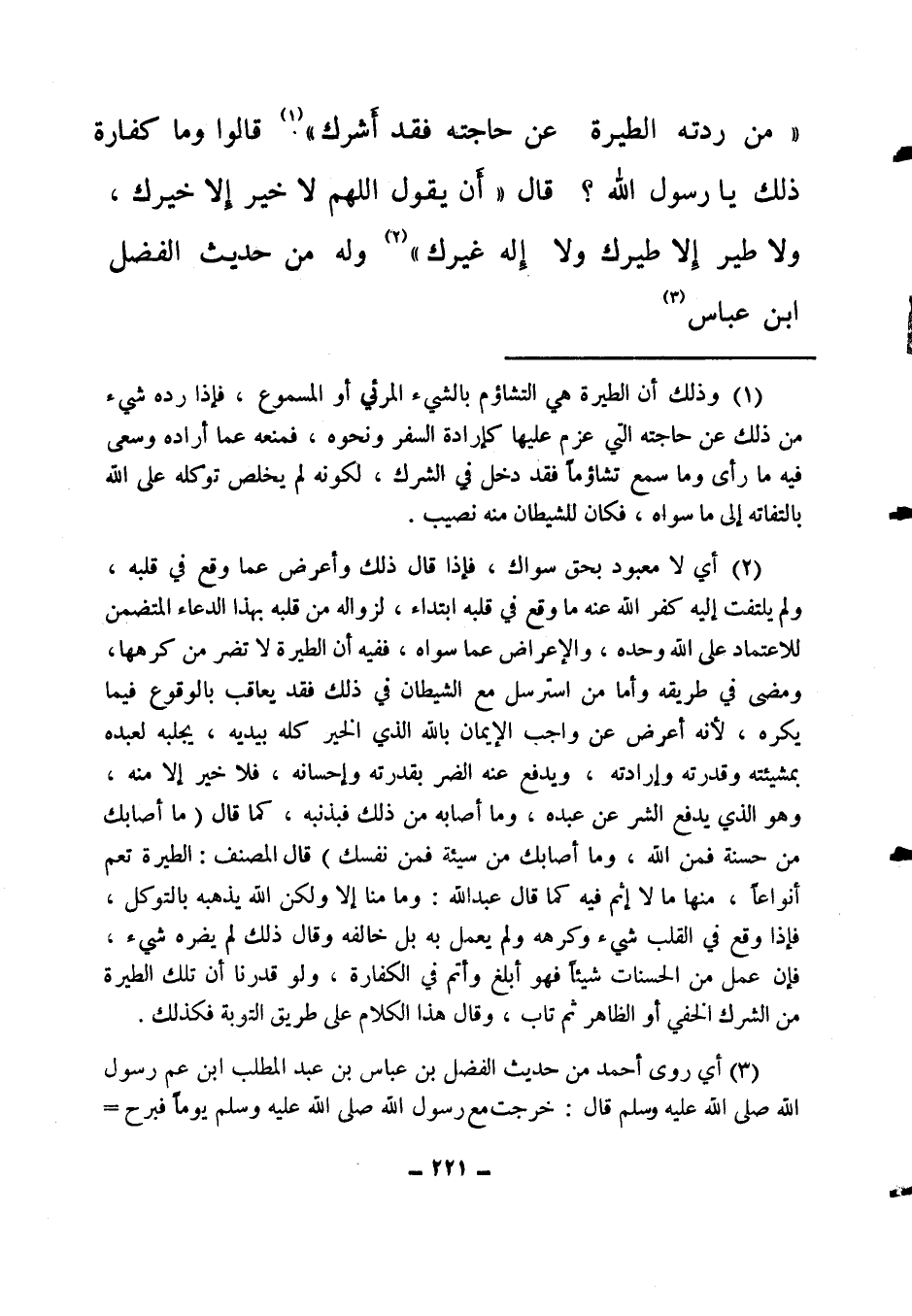 (1) وذلك أن الطيرة هي التشاؤم بالشيء المرئي أو المسموع، فإذا رده شيء من ذلك عن حاجته التي عزم عليها كإرادة السفر ونحوه، فمنعه عما أراده وسعى فيه ما رأى وما سمع تشاؤما فقد دخل في الشرك؛ لكونه لم يخلص توكله على الله بالتفاته إلى ما سواه، فكان للشيطان منه نصيب.