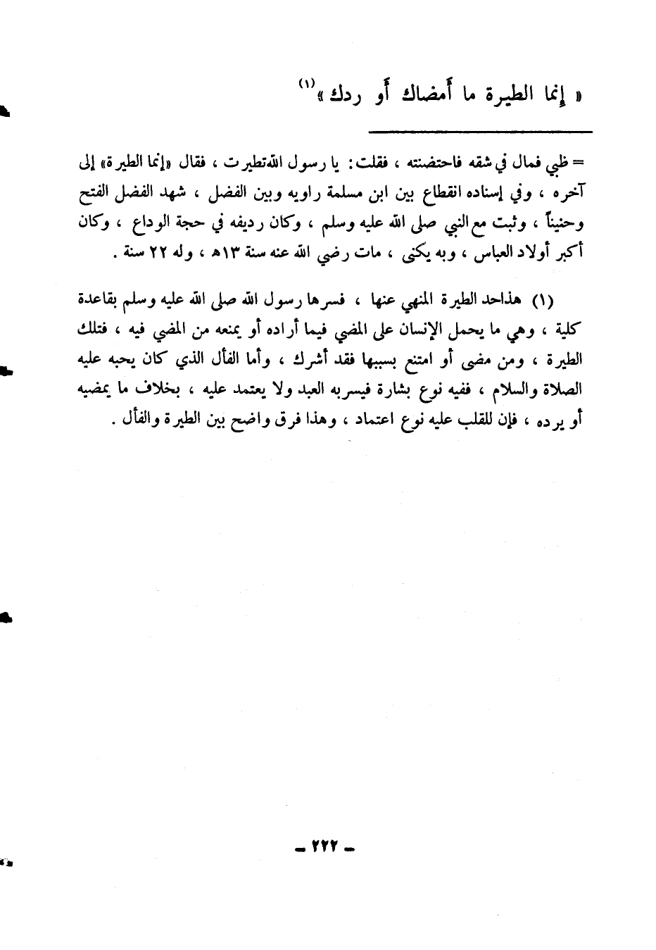(1) هذا حد الطيرة المنهي عنها فسرها رسول الله صلى الله عليه وسلم بقاعدة كلية، وهي ما يحمل الإنسان على المضي فيما أراده أو يمنعه من المضي فيه، فتلك الطيرة، ومن مضى أو امتنع بسببها فقد أشرك، وأما الفأل الذي كان يحبه -عليه الصلاة والسلام-، ففيه نوع بشارة فيسربه العبد ولا يعتمد عليه، بخلاف ما يمضيه أو يرده؛ فإن للقلب عليه نوع اعتماد، وهذا فرق واضح بين الطيرة والفأل.