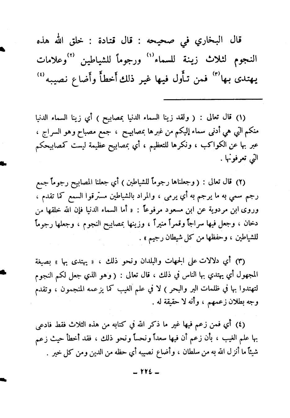 قال البخاري في صحيحه: قال قتادة: "خلق الله هذه النجوم لثلاث: زينة للسماء (1) ، ورجوما للشياطين (2) ، وعلامات يهتدي بها (3) ، فمن تأول فيها غير ذلك أخطأ وأضاع نصيبه (4) ،