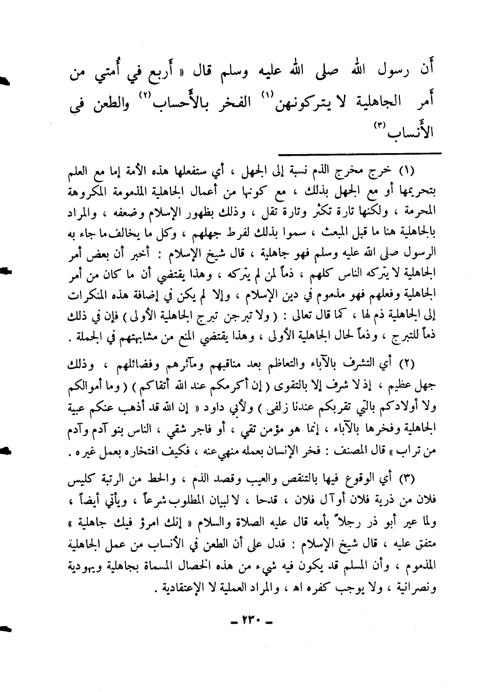 (3) أي الوقوع فيها بالتنقص والعيب وقصد الذم، والحط من الرتبة كليس فلان من ذرية فلان أو آل فلان، قدحا لا لبيان المطلوب شرعا، ويأتي أيضا. ولما عير أبو ذر رجلا بأمه قال -عليه الصلاة والسلام-: " إنك امرؤ فيك جاهلية " 5. متفق عليه، قال شيخ الإسلام: ((فدل على أن الطعن في الأنساب من عمل الجاهلية المذموم، وأن المسلم قد يكون فيه شيء من هذه الخصال المسماة بجاهلية ويهودية ونصرانية، ولا يوجب كفره)) اهـ، والمراد العملية لا الاعتقادية.