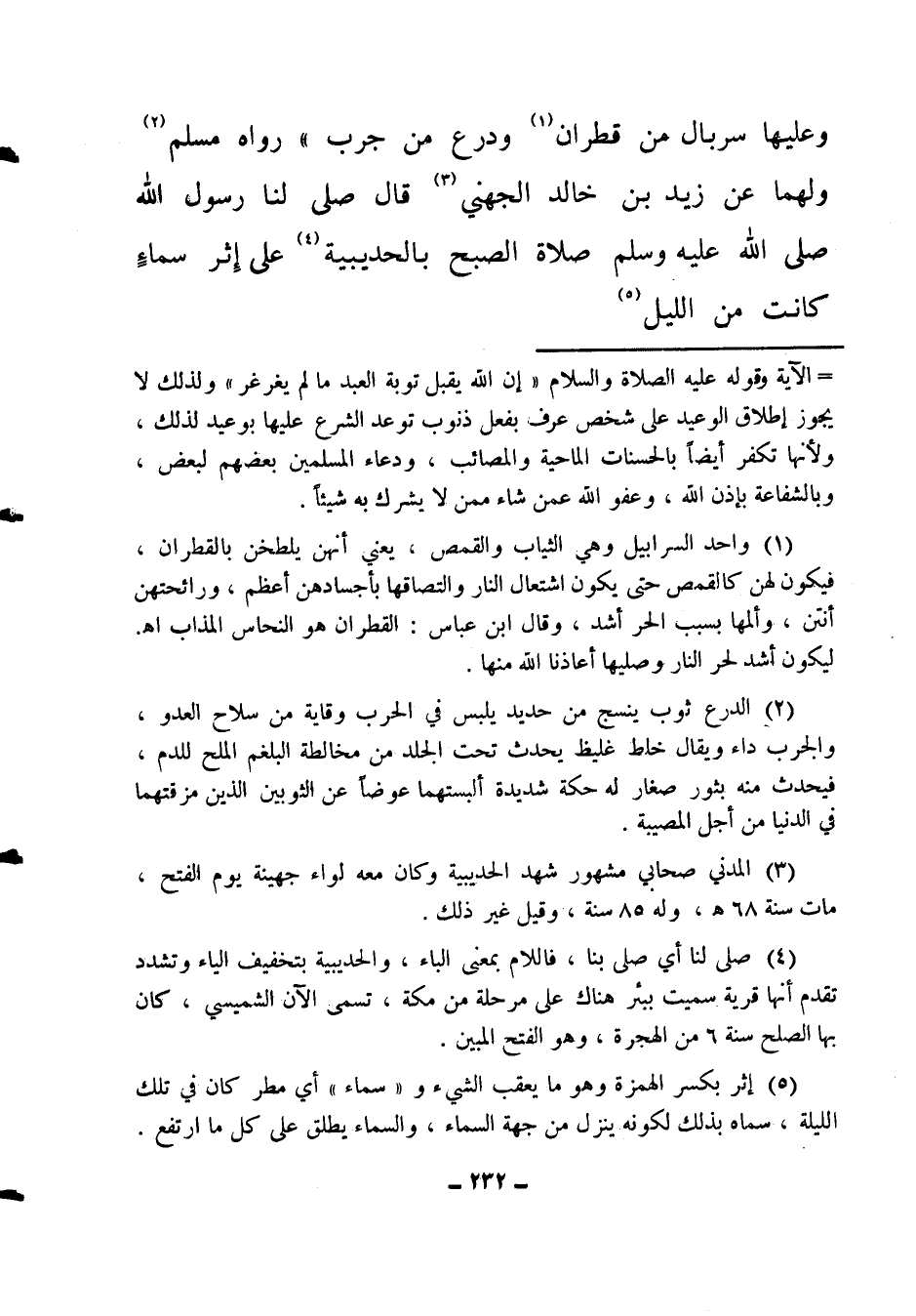 وعليها سربال من قطران (1) ودرع من جرب " 1. رواه مسلم (2) . ولهما عن زيد بن خالد الجهني (3) قال: " صلى لنا رسول الله صلى الله عليه وسلم صلاة الصبح بالحديبية (4) على إثر سماء كانت من الليل (5) ،