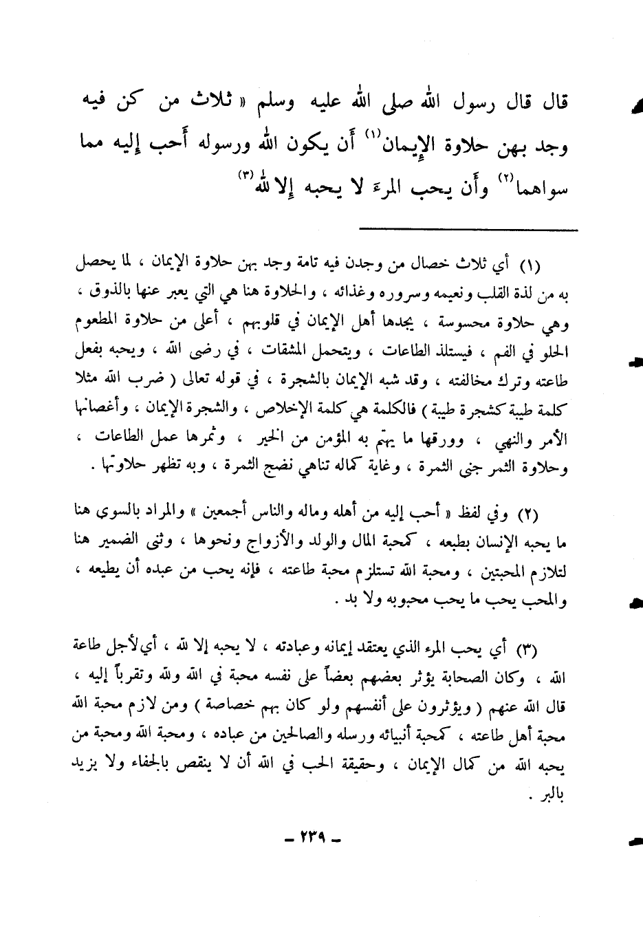 (1) أي ثلاث خصال من وجدن فيه تامة وجد بهن حلاوة الإيمان، لما يحصل به من لذة القلب ونعيمه وسروره وغذائه، والحلاوة هنا هي التي يعبر عنها بالذوق، وهي حلاوة محسوسة، يجدها أهل الإيمان في قلوبهم، أعلى من حلاوة المطعوم الحلو في الفم، فيستلذ الطاعات ويتحمل المشقات في رضى الله، ويحبه بفعل طاعته وترك مخالفته، وقد شبه الإيمان بالشجرة في قوله تعالى: {ضَرَبَ اللَّهُ مَثَلاً كَلِمَةً طَيِّبَةً كَشَجَرَةٍ طَيِّبَةٍ} 1، فالكلمة هي كلمة الإخلاص، والشجرة الإيمان، وأغصانها الأمر والنهي، وورقها ما يهتم به المؤمن من الخير، وثمرها عمل الطاعات، وحلاوة الثمر جني الثمرة، وغاية كماله تناهي نضج الثمرة، وبه تظهر حلاوتها.