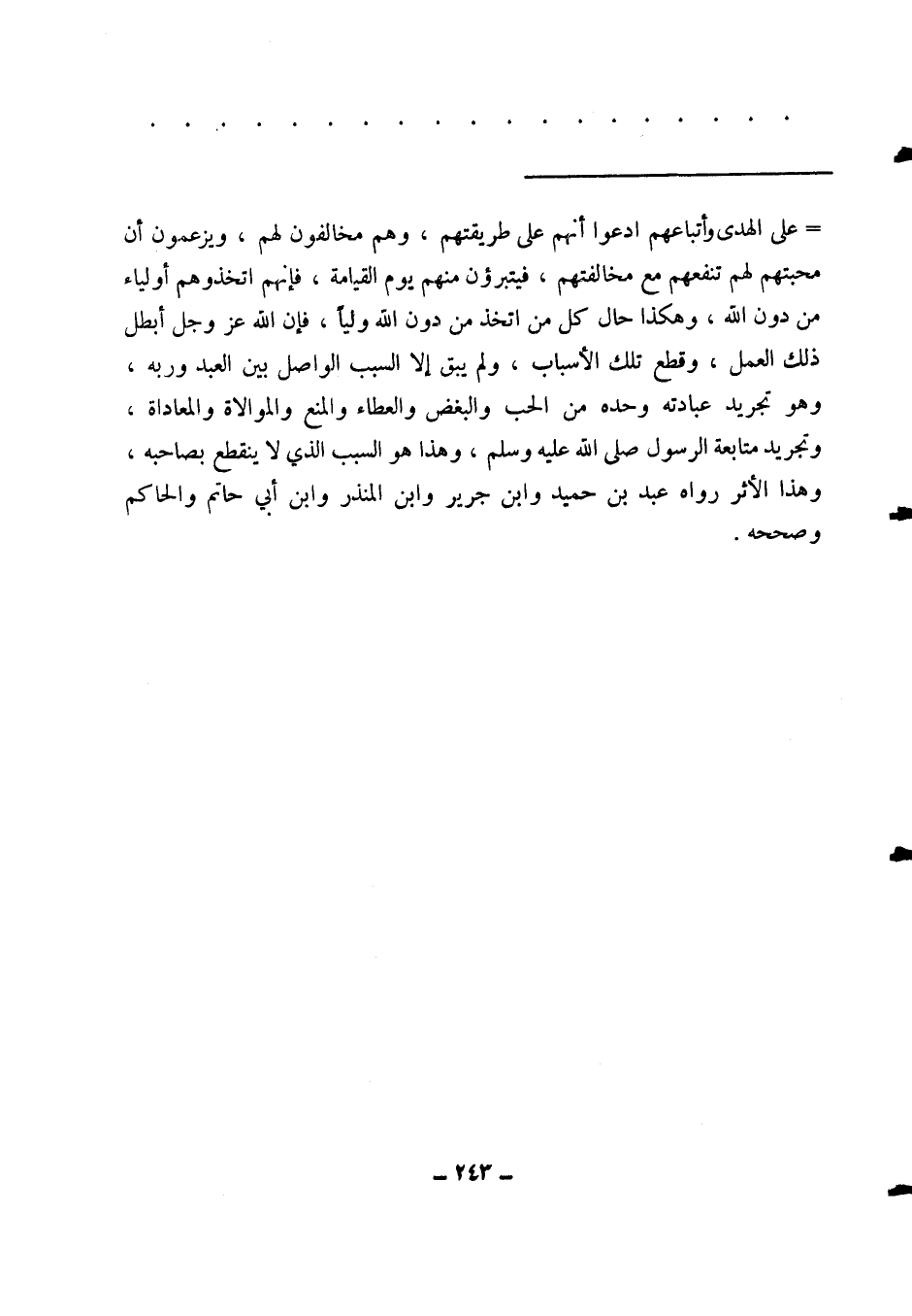 = على الهدى وأتباعهم ادعوا أنهم على طريقتهم، وهم مخالفون لهم، ويزعمون أن محبتهم لهم تنفعهم مع مخالفتهم، فيتبرؤون منهم يوم القيامة، فإنهم اتخذوهم أولياء من دون الله، وهكذا حال كل من اتخذ من دون الله وليا؛ فإن الله عز وجل أبطل ذلك العمل، وقطع تلك الأسباب، ولم يبق إلا السبب الواصل بين العبد وربه، وهو تجريد عبادته وحده من الحب والبغض والعطاء والمنع والموالاة والمعاداة، وتجريد متابعة الرسول صلى الله عليه وسلم، وهذا هو السبب الذي لا ينقطع بصاحبه. وهذا الأثر رواه عبد بن حميد وابن جرير وابن المنذر وابن أبي حاتم والحاكم وصححه.