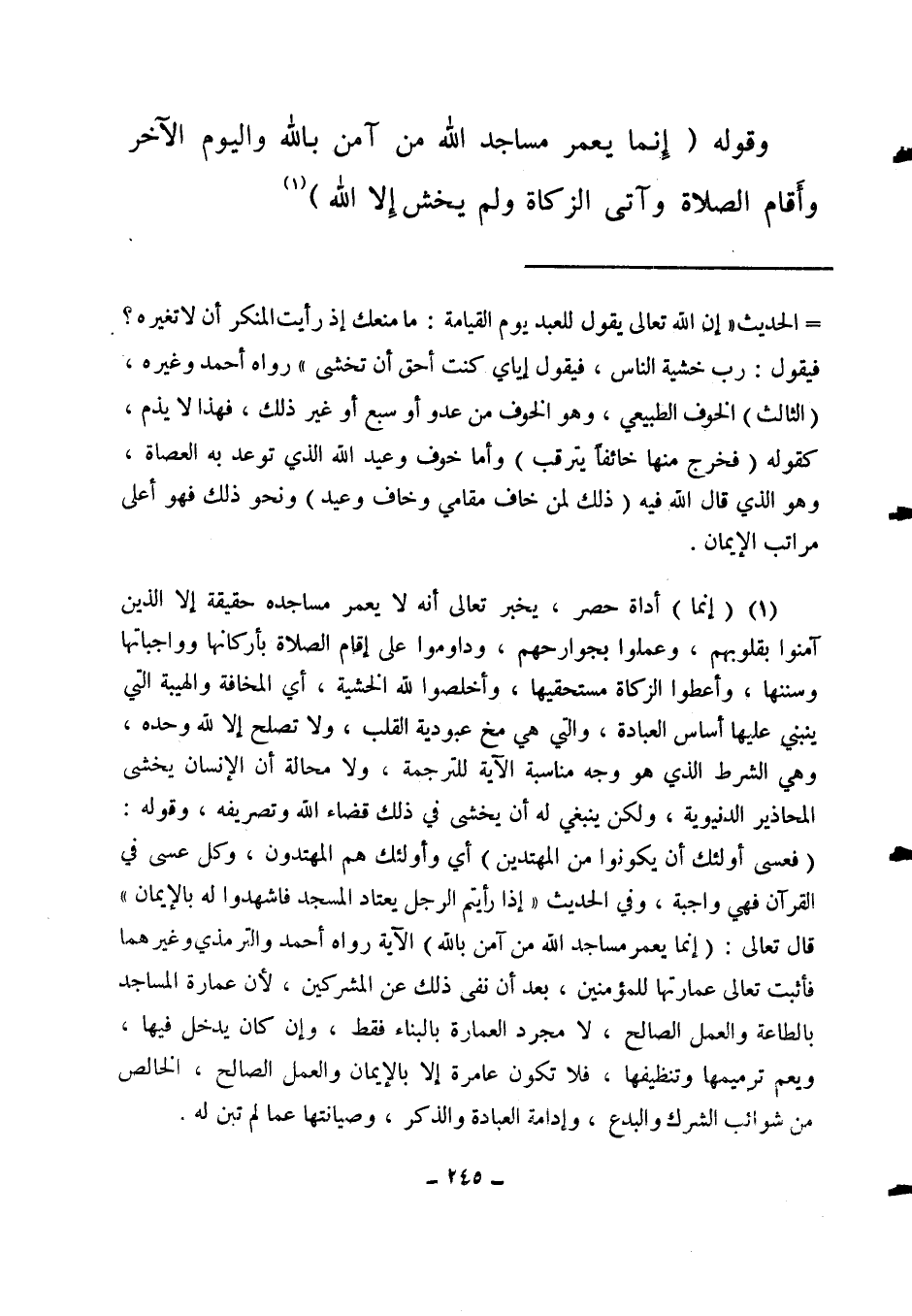 (1) (إنما) أداة حصر، يخبر تعالى أنه لا يعمر مساجده حقيقة إلا الذين آمنوا بقلوبهم، وعملوا بجوارحهم، وداوموا على إقام الصلاة بأركانها وواجباتها وسننها، وأعطوا الزكاة مستحقيها، وأخلصوا لله الخشية، أي المخافة والهيبة التي ينبني عليها أساس العبادة، والتي هي مخ عبودية القلب، ولا تصلح إلا لله وحده، وهي الشرط الذي هو وجه مناسبة الآية للترجمة، ولا محالة أن الإنسان يخشى المحاذير الدنيوية، ولكن ينبغي له أن يخشى في ذلك قضاء الله وتصريفه. وقوله: {فَعَسَى أُولَئِكَ أَنْ يَكُونُوا مِنَ الْمُهْتَدِينَ} 5 أي وأولئك هم المهتدون، وكل عسى في القرآن فهي واجبة. وفي الحديث: " إذا رأيتم الرجل يعتاد المسجد فاشهدوا له بالإيمان " 6. قال تعالى: {إِنَّمَا يَعْمُرُ مَسَاجِدَ اللَّهِ مَنْ آمَنَ بِاللَّهِ} الآية. رواه أحمد والترمذي وغيرهما. فأثبت تعالى عمارتها للمؤمنين بعد أن نفى ذلك عن المشركين؛ لأن عمارة المساجد بالطاعة والعمل الصالح، لا مجرد العمارة بالبناء فقط، وإن كان يدخل فيها، ويعم ترميمها وتنظيفها، فلا تكون عامرة إلا بالإيمان والعمل الصالح، الخالص من شوائب الشرك والبدع، وإدامة العبادة والذكر، وصيانتها عما لم تبن له.