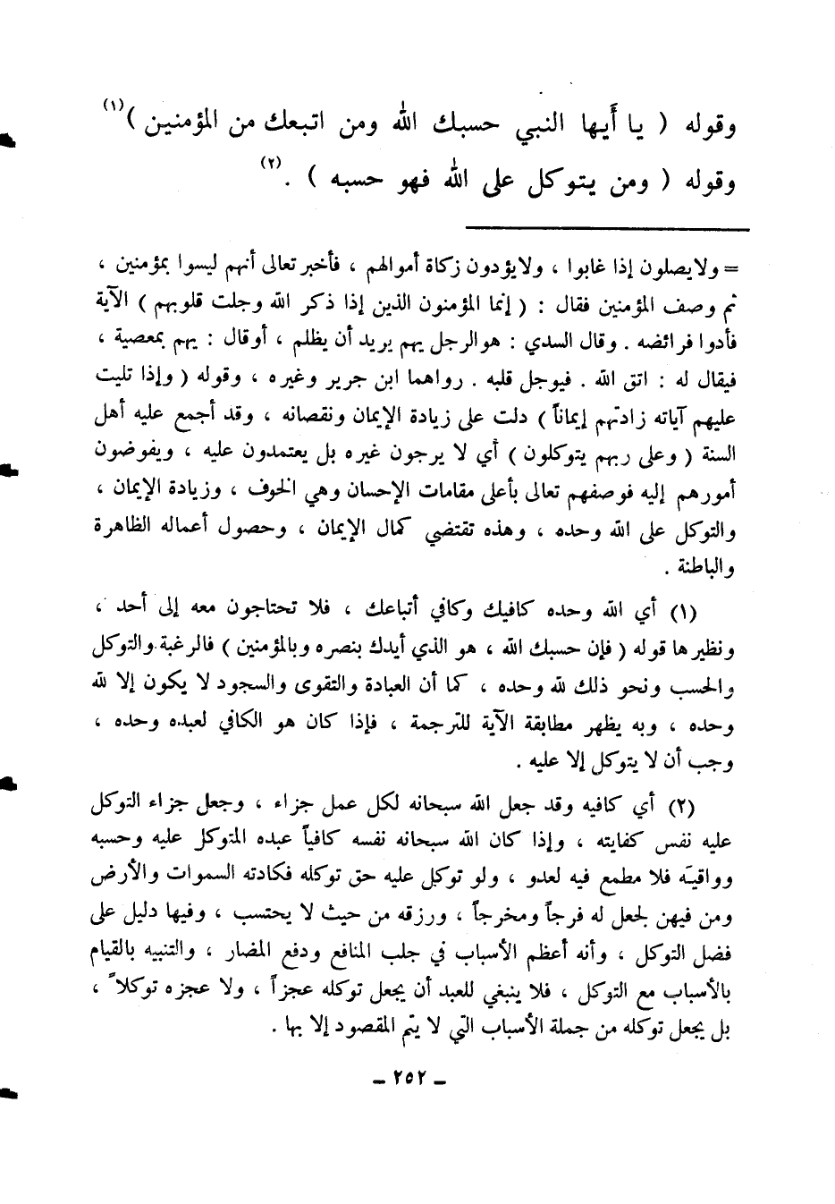 (1) أي الله وحده كافيك وكافي أتباعك، فلا تحتاجون معه إلى أحد، ونظيرها قوله: {فَإِنَّ حَسْبَكَ اللَّهُ هُوَ الَّذِي أَيَّدَكَ بِنَصْرِهِ وَبِالْمُؤْمِنِينَ} 3. فالرغبة والتوكل والحسب ونحو ذلك لله وحده، كما أن العبادة والتقوى والسجود لا يكون إلا لله وحده، وبه يظهر مطابقة الآية للترجمة، فإذا كان هو الكافي لعبده وحده، وجب أن لا يتوكل إلا عليه.