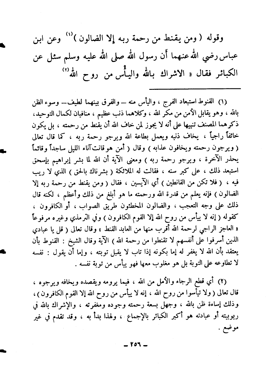 وعن ابن عباس -رضي الله عنهما- أن رسول الله صلى الله عليه وسلم " سئل عن الكبائر فقال: الإشراك بالله، واليأس من روح الله (2) ،