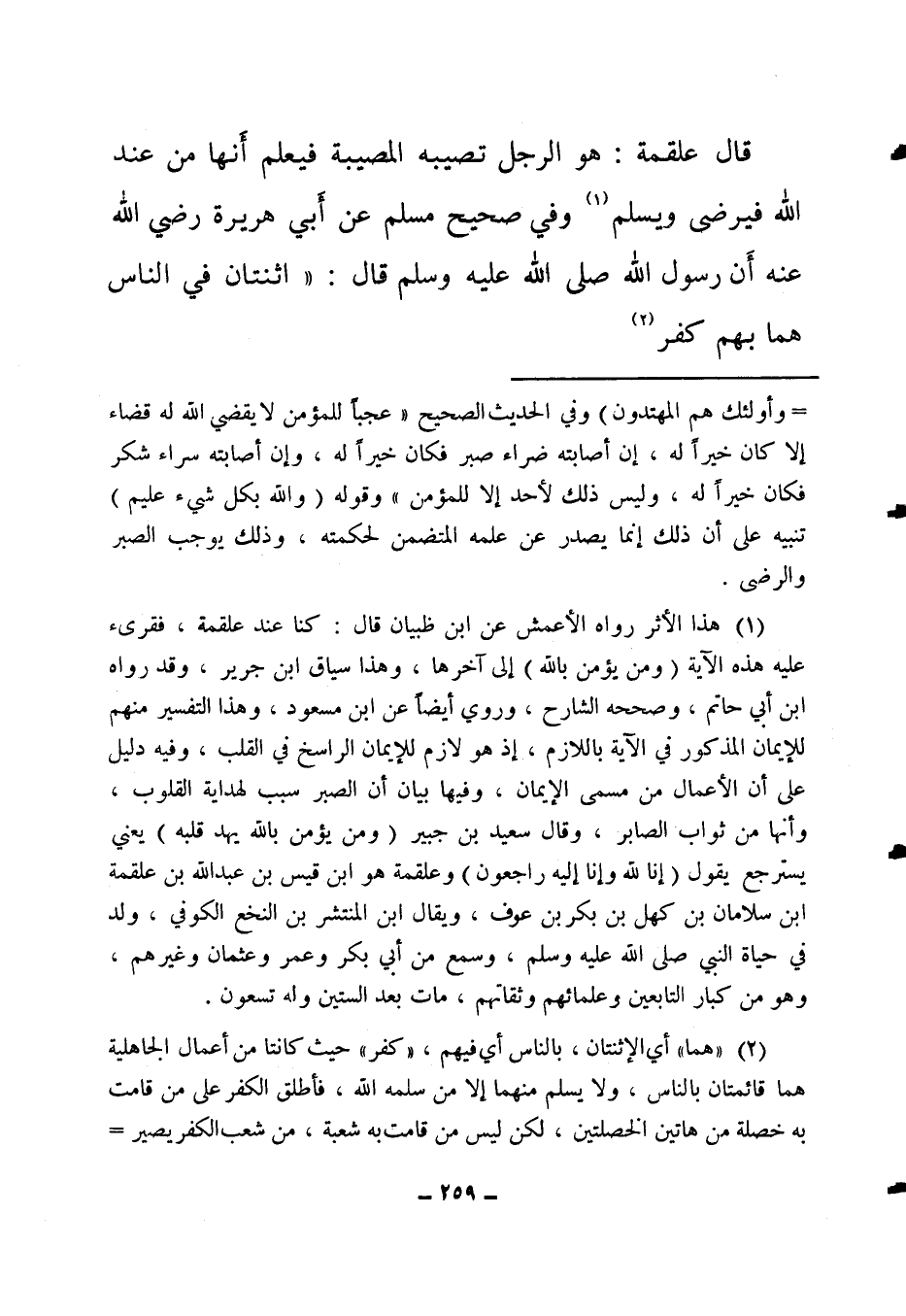 قال علقمة: ((هو الرجل تصيبه المصيبة، فيعلم أنها من عند الله فيرضى ويسلم)) (1)