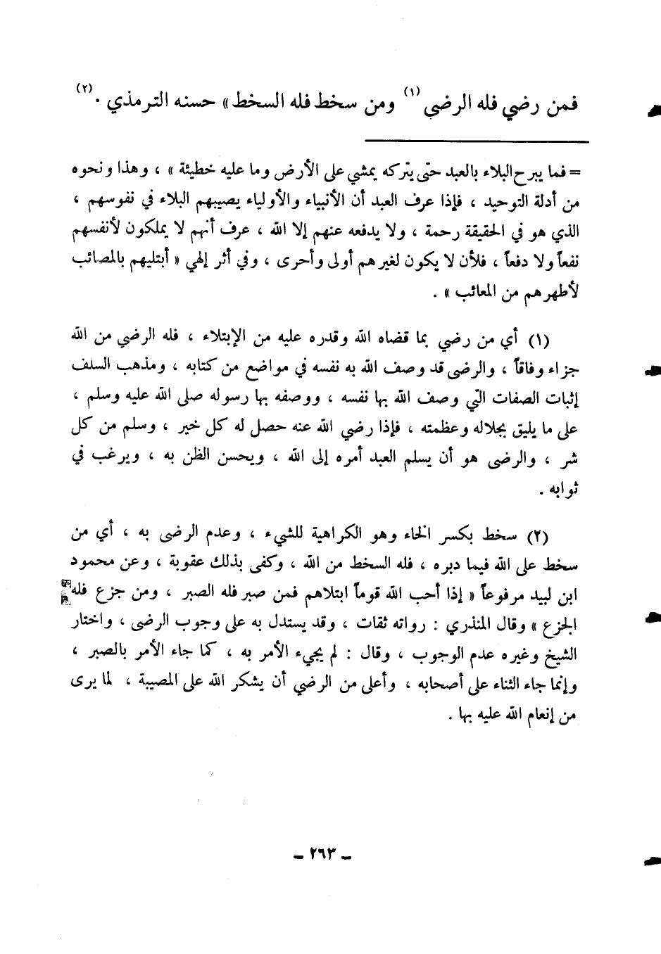 (2) سخط بكسر الخاء وهو الكراهية للشيء، وعدم الرضى به، أي من سخط على الله فيما دبره، فله السخط من الله، وكفى بذلك عقوبة. وعن محمود ابن لبيد مرفوعا: " إذا أحب الله قوما ابتلاهم فمن صبر فله الصبر، ومن جزع فله الجزع " 3. وقال المنذري: رواته ثقات. وقد يستدل به على وجوب الرضى، واختار الشيخ وغيره عدم الوجوب، وقال: لم يجئ الأمر به كما جاء الأمر بالصبر، وإنما جاء الثناء على أصحابه، وأعلى من الرضى أن يشكر الله على المصيبة، لما يرى من إنعام الله عليه بها.