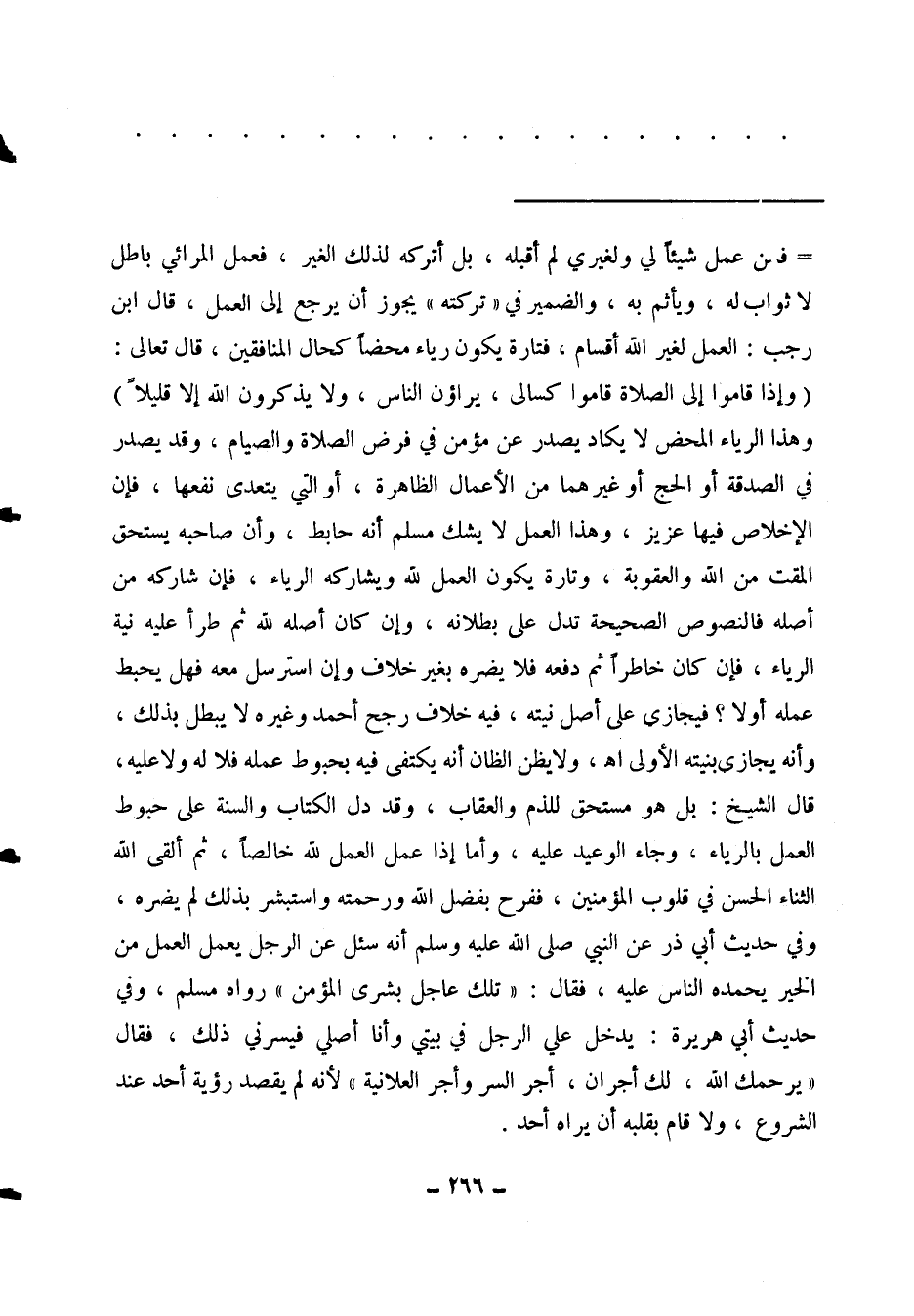 = فمن عمل شيئا لي ولغيري لم أقبله، بل أتركه لذلك الغير، فعمل المرائي باطل لا ثواب له، ويأثم به. والضمير في "تركته" يجوز أن يرجع إلى العمل. قال ابن رجب: ((العمل لغير الله أقسام: فتارة يكون رياء محضا كحال المنافقين، قال تعالى: {وَإِذَا قَامُوا إِلَى الصَّلاةِ قَامُوا كُسَالَى يُرَاؤُونَ النَّاسَ وَلا يَذْكُرُونَ اللَّهَ إِلاَّ قَلِيلاً} 1 وهذا الرياء المحض لا بكاد يصدر عن مؤمن في فرض الصلاة والصيام، وقد يصدر في الصدقة أو الحج أو غيرهما من الأعمال الظاهرة، أو التي يتعدى نفعها، فإن الإخلاص فيها عزيز، وهذا العمل لا يشك مسلم أنه حابط، وأن صاحبه يستحق المقت من الله والعقوبة، وتارة يكون العمل لله ويشاركه الرياء، فإن شاركه من أصله فالنصوص الصحيحة تدل على بطلانه، وإن كان أصله لله ثم طرأ عليه نية الرياء، فإن كان خاطرا ثم دفعه فلا يضره بغير خلاف، وإن استرسل معه فهل يحبط عمله أولا؟ فيجازى على أصل نيته، فيه خلاف، رجح أحمد وغيره لا يبطل بذلك، وأنه يجازى بنيته الأولى)) اهـ. ولا يظن الظان أنه يكتفي فيه بحبوط عمله فلا له ولا عليه، قال الشيخ: بل هو مستحق للذم والعقاب، وقد دل الكتاب والسنة على حبوط العمل بالرياء، وجاء الوعيد عليه، وأما إذا عمل العمل لله خالصا، ثم ألقى الله الثناء الحسن في قلوب المؤمنين، ففرح بفضل الله ورحمته واستبشر بذلك لم يضره، وفي حديث أبي ذر عن النبي صلى الله عليه وسلم أنه سئل عن الرجل يعمل العمل من الخير يحمده الناس عليه، فقال: " تلك عاجل بشرى المؤمن "2 رواه مسلم. وفي حديث أبي هريرة: يدخل علي الرجل في بيتي وأنا أصلي فيسرني ذلك، فقال: " يرحمك الله، لك أجران: أجر السر وأجر العلانية "3؛ لأنه لم يقصد رؤية أحد عند الشروع، ولا قام بقلبه أن يراه أحد.