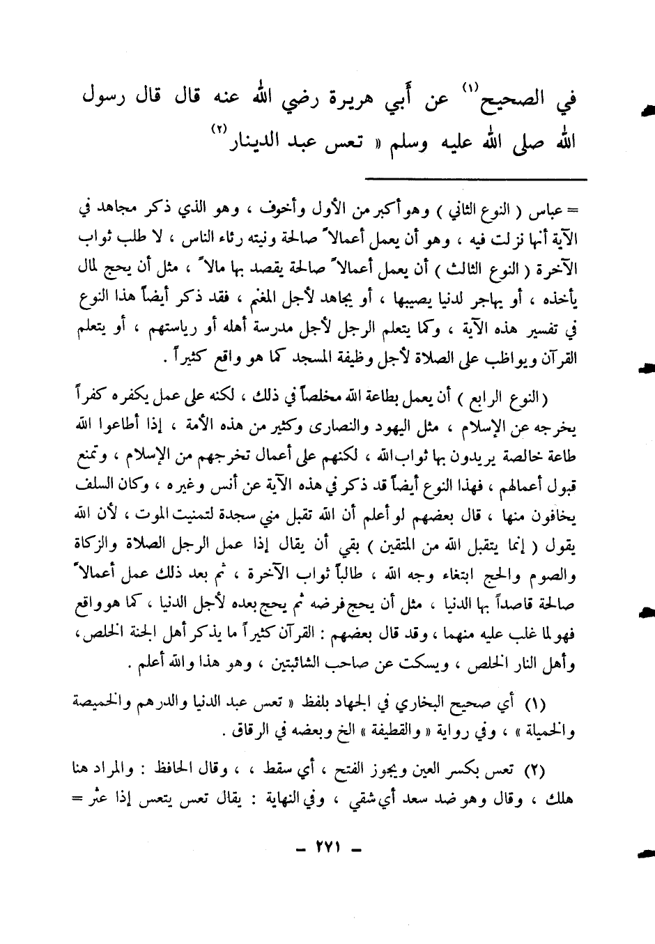 (1) أي صحيح البخاري في الجهاد بلفظ: " تعس عبد الدنيا والدرهم والخميصة والخميلة "2. وفي رواية: "والقطيفة" الخ وبعضه في الرقاق.