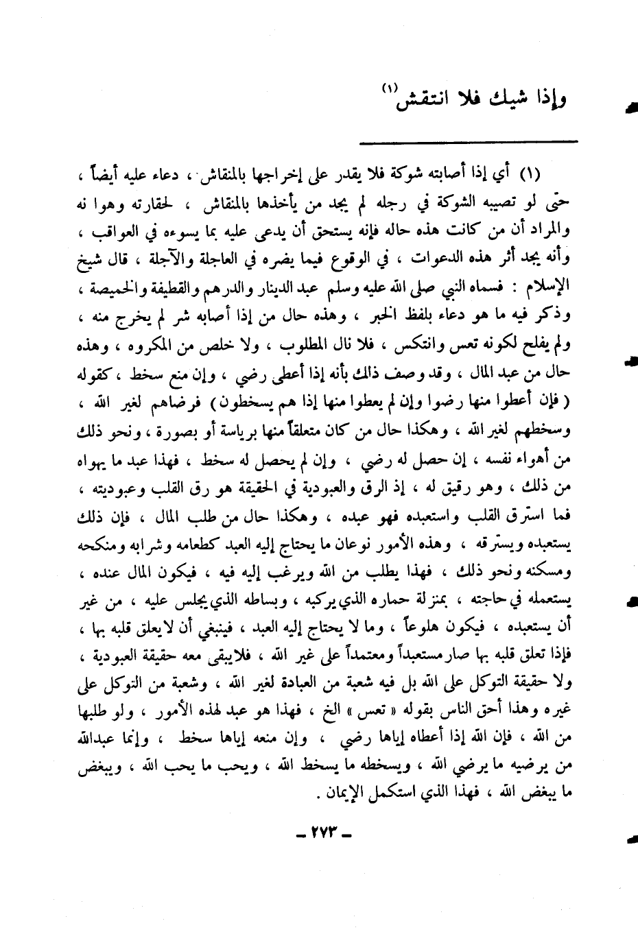(1) أي إذا أصابته شوكة فلا يقدر على إخراجها بالمنقاش، دعاء عليه أيضا، حتى لو تصيبه الشوكة في رجله لم يجد من يأخذها بالمنقاش، لحقارته وهوانه والمراد أن من كانت هذه حاله فإنه يستحق أن يدعى عليه بما يسوءه في العواقب، وأنه يجد أثر هذه الدعوات، في الوقوع فيما يضره في العاجلة والآجلة. قال شيخ الإسلام: فسماه النبي صلى الله عليه وسلم عبد الدينار والدرهم والقطيفة والخميصة، وذكر فيه ما هو دعاء بلفظ الخبر، وهذه حال من إذا أصابه شر لم يخرج منه، ولم يفلح لكونه تعس وانتكس، فلا نال المطلوب، ولا خلص من المكروه، وهذه حال من عبد المال، وقد وصف ذلك بأنه إذا أعطي رضي، وإن منع سخط، كقوله: {فَإِنْ أُعْطُوا مِنْهَا رَضُوا وَإِنْ لَمْ يُعْطَوْا مِنْهَا إِذَا هُمْ يَسْخَطُونَ} 1 فرضاهم لغير الله، وسخطهم لغير الله، وهكذا حال من كان متعلقا منها برياسة أو بصورة، ونحو ذلك من أهواء نفسه، إن حصل له رضي، وإن لم يحصل له سخط، فهذا عبد ما يهواه من ذلك، وهو رقيق له؛ إذ الرق والعبودية في الحقيقة هو رق القلب وعبوديته، فما استرق القلب واستعبده فهو عبده، وهكذا حال من طلب المال، فإن ذلك يستعبده ويسترقه، وهذه الأمور نوعان: ما يحتاج إليه العبد كطعامه وشرابه ومنكحه ومسكنه ونحو ذلك، فهذا يطلب من الله ويرغب إليه فيه، فيكون المال عنده، يستعمله في حاجته، بمنزلة حماره الذي يركبه، وبساطه الذي يجلس عليه، من غير أن يستعبده، فيكون هلوعا. وما لا يحتاج إليه العبد، فينبغي أن لا يعلق قلبه بها، فإذا تعلق قلبه بها صار مستعبدا ومعتمدا على غير الله، فلا يبقى معه حقيقة العبودية، ولا حقيقة التوكل على الله بل فيه شعبة من العبادة لغير الله، وشعبة من التوكل على غيره، وهذا أحق الناس بقوله: "تعس" الخ، فهذا هو عبد لهذه الأمور، ولو طلبها من الله، فإن الله إذا أعطاه إياها رضي، وإن منعه إياها سخط، وإنما عبد الله من يرضيه ما يرضي الله، ويسخطه ما يسخط الله، ويحب ما يحب الله، ويبغض ما يبغض الله، فهذا الذي استكمل الإيمان.