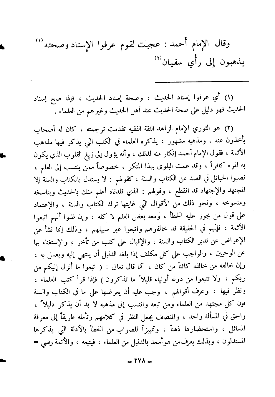(2) هو الثوري الإمام الزاهد الثقة الفقيه تقدمت ترجمته، كان له أصحاب يأخذون عنه، ومذهبه مشهور، يذكره العلماء في الكتب التي يذكر فيها مذاهب الأئمة، فقول الإمام أحمد إنكار منه لذلك، وأنه يؤول إلى زيغ القلوب الذي يكون به المرء كافرا، وقد عمت البلوى بهذا المنكر، خصوصا ممن ينتسب إلى العلم، نصبوا الحبائل في الصد عن الكتاب والسنة، كقولهم: لا يستدل بالكتاب والسنة إلا المجتهد والاجتهاد قد انقطع. وقولهم: الذي قلدناه أعلم منك بالحديث وبناسخه ومنسوخه، ونحو ذلك من الأقوال التي غايتها ترك الكتاب والسنة، والاعتماد على قول من يجوز عليه الخطأ، ومعه بعض العلم لا كله، وإن ظنوا أنهم اتبعوا الأئمة، فإنهم في الحقيقة قد خالفوهم واتبعوا غير سبيلهم، وذلك إنما نشأ عن الإعراض عن تدبر الكتاب والسنة، والإقبال على كتب من تأخر، والاستغناء بها عن الوحيين، والواجب على كل مكلف إذا بلغه الدليل أن ينتهي إليه ويعمل به، وإن خالفه من خالفه كائنا من كان، كما قال تعالى: {اتَّبِعُوا مَا أُنْزِلَ إِلَيْكُمْ مِنْ رَبِّكُمْ وَلا تَتَّبِعُوا مِنْ دُونِهِ أَوْلِيَاءَ قَلِيلاً مَا تَذَكَّرُونَ} 1. فإذا قرأ كتب العلماء ونظر فيها، وعرف أقوالهم، وجب عليه أن يعرضها على ما في الكتاب والسنة؛ فإن كل مجتهد من العلماء ومن تبعه وانتسب إلى مذهبه لا بد أن يذكر دليلا، والحق في المسألة واحد، والمنصف يجعل النظر في كلامهم وتأمله طريقا إلى معرفة المسائل، واستحضارها ذهنا، وتمييزا للصواب من الخطأ بالأدلة التي يذكرها المستدلون، وبذلك يعرف من هو أسعد بالدليل من العلماء، فيتبعه، والأئمة -رضي =