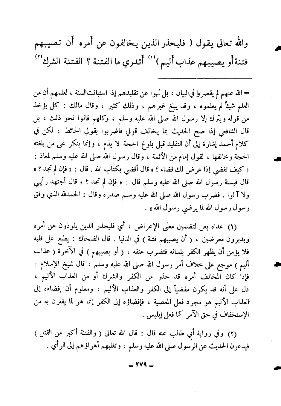 والله تعالى يقول: {فَلْيَحْذَرِ الَّذِينَ يُخَالِفُونَ عَنْ أَمْرِهِ أَنْ تُصِيبَهُمْ فِتْنَةٌ أَوْ يُصِيبَهُمْ عَذَابٌ أَلِيمٌ} 1 (1) أتدري ما الفتنة؟ الفتنة الشرك (2) ؛