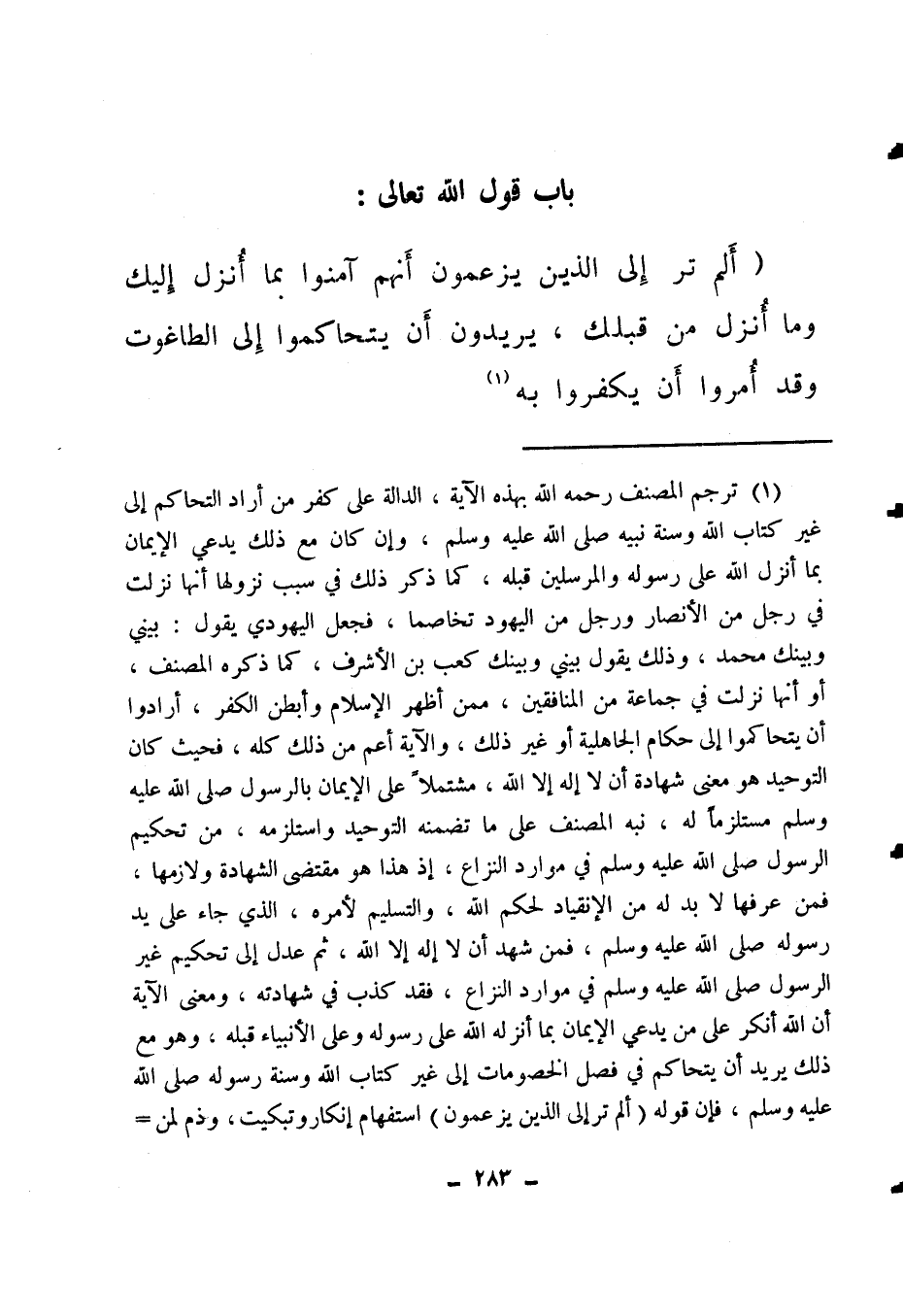 (1) ترجم المصنف -رحمه الله- بهذه الآية، الدالة على كفر من أراد التحاكم إلى غير كتاب الله وسنة نبيه صلى الله عليه وسلم، وإن كان مع ذلك يدعي الإيمان بما أنزل الله على رسوله والمرسلين قبله، كما ذكر ذلك في سبب نزولها أنها نزلت في رجل من الأنصار ورجل من اليهود تخاصما، فجعل اليهودي يقول: بيني وبينك محمد، وذلك يقول: بيني وبينك كعب بن الأشرف، كما ذكره المصنف. أو أنها نزلت في جماعة من المنافقين ممن أظهر الإسلام وأبطن الكفر، أرادوا أن يتحاكموا إلى حكام الجاهلية أو غير ذلك، والآية أعم من ذلك كله، فحيث كان التوحيد هو معنى شهادة أن لا إله إلا الله مشتملا على الإيمان بالرسول صلى الله عليه وسلم مستلزما له، نبه المصنف على ما تضمنه التوحيد واستلزمه، من تحكيم الرسول صلى الله عليه وسلم في موارد النزاع؛ إذ هذا هو مقتضى الشهادة ولازمها، فمن عرفها لا بد له من الانقياد لحكم الله، والتسليم لأمره الذي جاء على يد رسوله صلى الله عليه وسلم، فمن شهد أن لا إله إلا الله، ثم عدل إلى تحكيم غير الرسول صلى الله عليه وسلم في موارد النزاع، فقد كذب في شهادته. ومعنى الآية أن الله أنكر على من يدعي الإيمان بما أنزله الله على رسوله وعلى الأنبياء قبله، وهو مع ذلك يريد أن يتحاكم في فصل الخصومات إلى غير كتاب الله وسنة رسوله صلى الله عليه وسلم؛ فإن قوله: {أَلَمْ تَرَ إِلَى الَّذِينَ يَزْعُمُونَ} استفهام إنكار وتبكيت، وذم لمن =