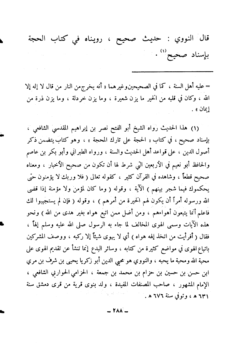 (1) هذا الحديث رواه الشيخ أبو الفتح نصر بن إبراهيم المقدسي الشافعي بإسناد صحيح في كتاب "الحجة على تارك المحجة"، وهو كتاب يتضمن ذكر أصول الدين على قواعد أهل الحديث والسنة. ورواه الطبراني وأبو بكر بن عاصم والحافظ أبو نعيم في الأربعين التي شرط لها أن تكون من صحيح الأخبار، ومعناه صحيح قطعا، وشاهده في القرآن كثير، كقوله تعالى: {فَلا وَرَبِّكَ لا يُؤْمِنُونَ حَتَّى يُحَكِّمُوكَ فِيمَا شَجَرَ بَيْنَهُمْ} 2 الآية، وقوله: {مَا كَانَ لِمُؤْمِنٍ وَلا مُؤْمِنَةٍ إِذَا قَضَى اللَّهُ وَرَسُولُهُ أَمْراً أَنْ يَكُونَ لَهُمُ الْخِيَرَةُ مِنْ أَمْرِهِمْ} 3، وقوله: {فَإِنْ لَمْ يَسْتَجِيبُوا لَكَ فَاعْلَمْ أَنَّمَا يَتَّبِعُونَ أَهْوَاءَهُمْ وَمَنْ أَضَلُّ مِمَّنِ اتَّبَعَ هَوَاهُ بِغَيْرِ هُدىً مِنَ اللَّهِ إ} 4. ونحو هذه الآيات. وسمى الهوى المخالف لما جاء به الرسول صلى الله عليه وسلم إلها، فقال: {أَفَرَأَيْتَ مَنِ اتَّخَذَ إِلَهَهُ هَوَاهُ} 5 أي لا يهوى شيئا إلا ركبه، ووصف المشركين باتباع الهوى في مواضع كثيرة من كتابه، وسائر البدع إنما تنشأ عن تقديم الهوى على محبة الله ومحبة ما يحبه. والنووي: هو محيي الدين أبو زكريا يحيى بن شرف بن مري بن حسن بن حسين بن حزام بن محمد بن جمعة، الحزامي الحواربي الشافعي، الإمام المشهور، صاحب المصنفات المفيدة، ولد بنوى قرية من قرى دمشق سنة 631هـ، وتوفي سنة 676هـ.
