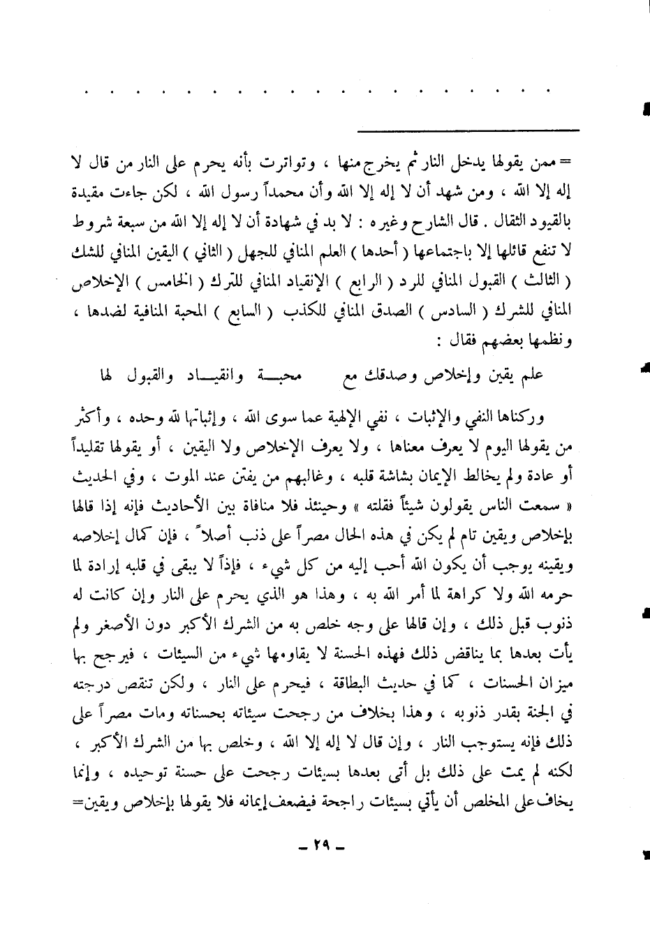 قال الشارح وغيره: لا بد في شهادة ألا إله إلا الله من سبعة شروط لا تنفع قائلها إلا باجتماعها: