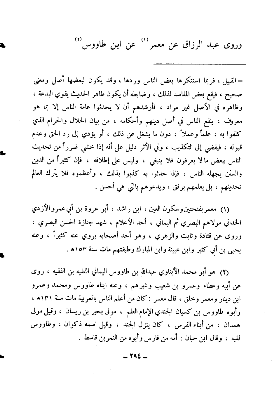 (2) هو أبو محمد الأبناوي عبد الله بن طاووس اليماني الفقيه بن الفقيه، روي عن أبيه وعطاء وعمرو بن شعيب وغيرهم، وعنه ابناه طاووس ومحمد وعمرو ابن دينار ومعمر وخلق، قال معمر: كان من أعلم الناس بالعربية، مات سنة 131هـ. وأبوه طاووس بن كسيان الجندي الإمام العلم، مولى بحير بن ريسان، وقيل: مولى همدان، من أبناء الفرس، كان ينزل الجند، وقيل اسمه ذكوان، وطاوس لقبه. وقال ابن حبان: ((أمه من فارس وأبوه من النمر بن قاسط)) .