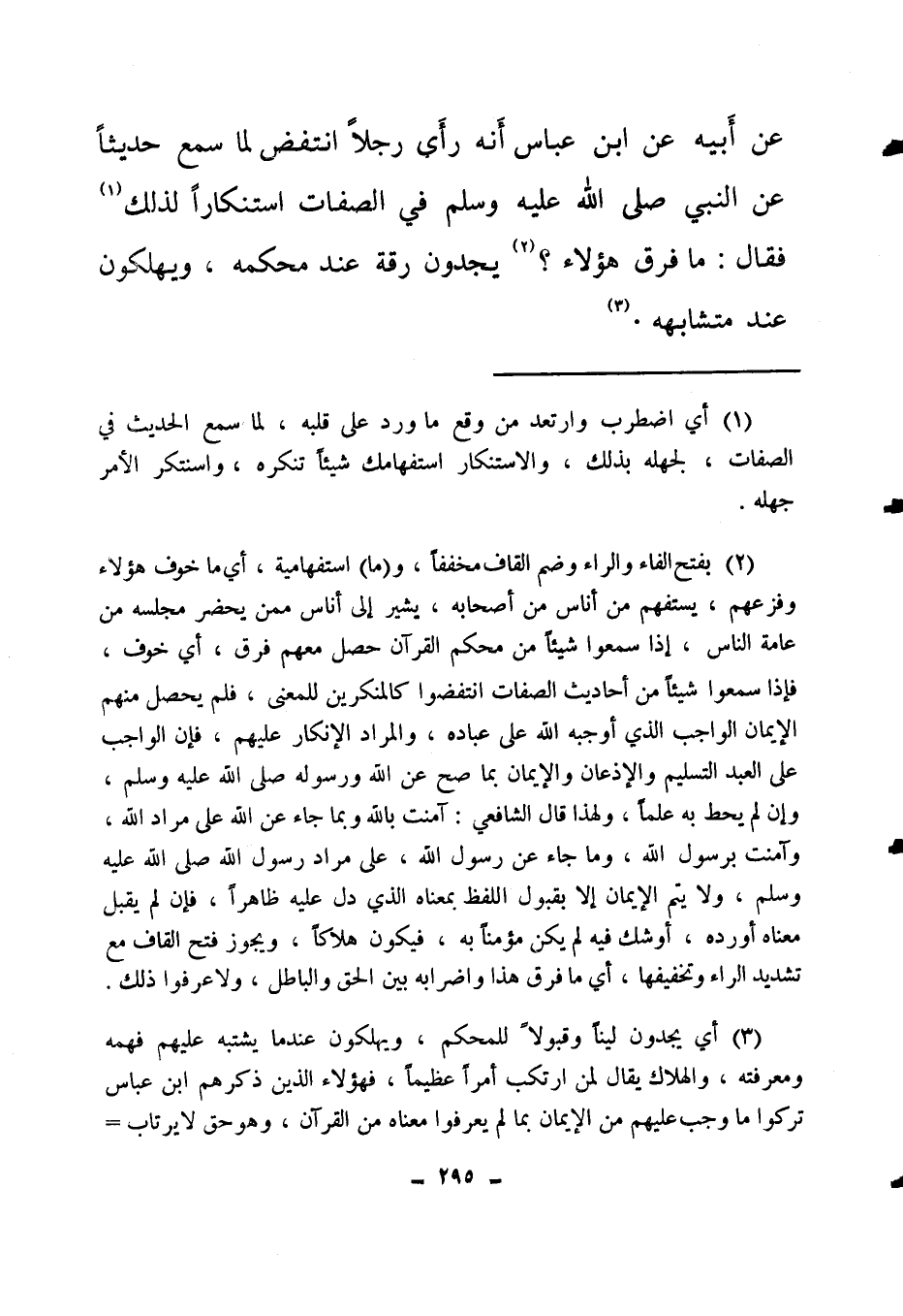 عن أبيه عن ابن عباس أنه " رأى رجلا انتفض لما سمع حديثا عن النبي صلى الله عليه وسلم في الصفات استنكارا لذلك (1) ، فقال: ما فرق هؤلاء؟ (2) يجدون رقة عند محكمه، ويهلكون عند متشابهه " (3) .