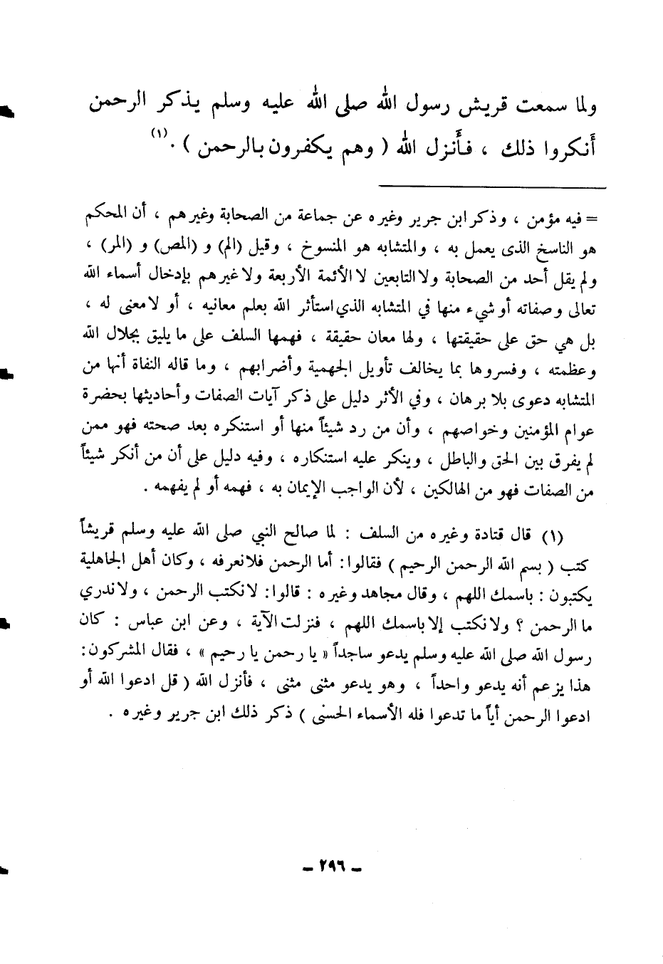 = فيه مؤمن. وذكر ابن جرير وغيره عن جماعة من الصحابة وغيرهم، أن المحكم هو الناسخ الذي يعمل به، والمتشابه هو المنسوخ. وقيل: (الم) و (المص) و (المر) ، ولم يقل أحد من الصحابة ولا التابعين لا الأئمة الأربعة ولا غيرهم بإدخال أسماء الله تعالى وصفاته أو شيء منها في المتشابه الذي استأثر الله بعلم معانيه، أو لا معنى له، بل هي حق على حقيقتها، ولها معان حقيقة فهمها السلف على ما يليق بجلال الله وعظمته، وفسروها بما يخالف تأويل الجهمية وأضرابهم، وما قاله النفاة أنها من المتشابه دعوى بلا برهان، وفي الأثر دليل على ذكر آيات الصفات وأحاديثها بحضرة عوام المؤمنين وخواصهم، وأن من رد شيئا منها أو استنكره بعد صحته فهو ممن لم يفرق بين الحق والباطل، وينكر عليه استنكاره، وفيه دليل على أن من أنكر شيئا من الصفات فهو من الهالكين؛ لأن الواجب الإيمان به، فهمه أو لم يفهمه.