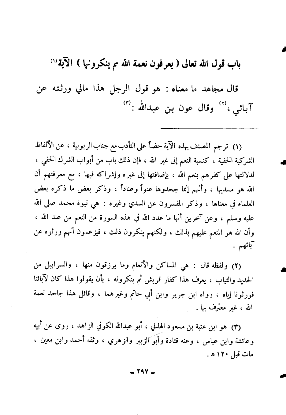 (2) ولفظه قال: ((هي المساكن والأنعام وما يرزقون منها، والسرابيل من الحديد والثياب، يعرف هذا كفار قريش ثم ينكرونه، بأن يقولوا هذا كان لآبائنا فورثونا إياه)) . رواه ابن جرير وابن أبي حاتم وغيرهما، وقائل هذا جاحد نعمة الله، غير معترف بها.