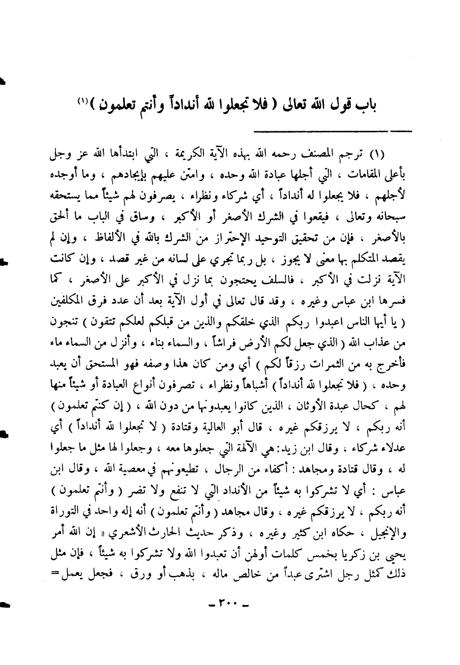 (1) ترجم المصنف - رحمه الله - بهذه الآية الكريمة، التي ابتدأها الله عز وجل بأعلى المقامات التي أجلها عبادة الله وحده، وامتن عليهم بإيجادهم، وما أوجده لأجلهم، فلا يجعلوا له أندادا، أي شركاء ونظراء، يصرفون لهم شيئا مما يستحقه سبحانه وتعالى، فيقعوا في الشرك الأصغر أو الأكبر، وساق في الباب ما ألحق بالأصغر، فإن من تحقيق التوحيد الاحتراز من الشرك بالله في الألفاظ، وإن لم يقصد المتكلم بها معنى لا يجوز، بل ربما تجري على لسانه من غير قصد، وإن كانت الآية نزلت في الأكبر، فالسلف يحتجون بما نزل في الأكبر على الأصغر، كما فسرها ابن عباس وغيره، وقد قال تعالى في أول الآية بعد أن عدد فرق المكلفين: {يَا أَيُّهَا النَّاسُ اعْبُدُوا رَبَّكُمُ الَّذِي خَلَقَكُمْ وَالَّذِينَ مِنْ قَبْلِكُمْ لَعَلَّكُمْ تَتَّقُونَ} 1 تنجون من عذاب الله {الَّذِي جَعَلَ لَكُمُ الأَرْضَ فِرَاشاً وَالسَّمَاءَ بِنَاءً وَأَنْزَلَ مِنَ السَّمَاءِ مَاءً فَأَخْرَجَ بِهِ مِنَ الثَّمَرَاتِ رِزْقاً لَكُمْ} 2 أي ومن كان هذا وصفه فهو المستحق أن يعبد وحده،: {فَلا تَجْعَلُوا لِلَّهِ أَنْدَاداً وَأَنْتُمْ تَعْلَمُونَ} 3 أشباها ونظراء، تصرفون أنواع العبادة أو شيئا منها لهم، كحال عبدة الأوثان، الذين كانوا يعبدونها من دون الله،: {إِنْ كُنْتُمْ تَعْلَمُونَ} 4 أنه ربكم لا يرزقكم غيره. قال أبو العالية وقتادة: {فَلا تَجْعَلُوا لِلَّهِ أَنْدَاداً} 5 أي عدلاء شركاء. وقال ابن زيد: هي الآلهة التي جعلوها معه، وجعلوا لها مثل ما جعلوا له. وقال قتادة ومجاهد: أكفاء من الرجال تطيعونهم في معصية الله، وقال ابن عباس: أي لا تشركوا به شيئا من الأنداد التي لا تنفع ولا تضر: {وَأَنْتُمْ تَعْلَمُونَ} أنه ربكم، لا يرزقكم غيره. وقال مجاهد: {وَأَنْتُمْ تَعْلَمُونَ} أنه إله واحد في التوراة والإنجيل. حكاه ابن كثير وغيره، وذكر حديث الحارث الأشعري " إن الله أمر يحيى بن زكريا بخمس كلمات: أولهن أن تعبدوا الله ولا تشركوا به شيئا، فإن مثل ذلك كمثل رجل اشترى عبدا من خالص ماله، بذهب أو ورق، فجعل يعمل =