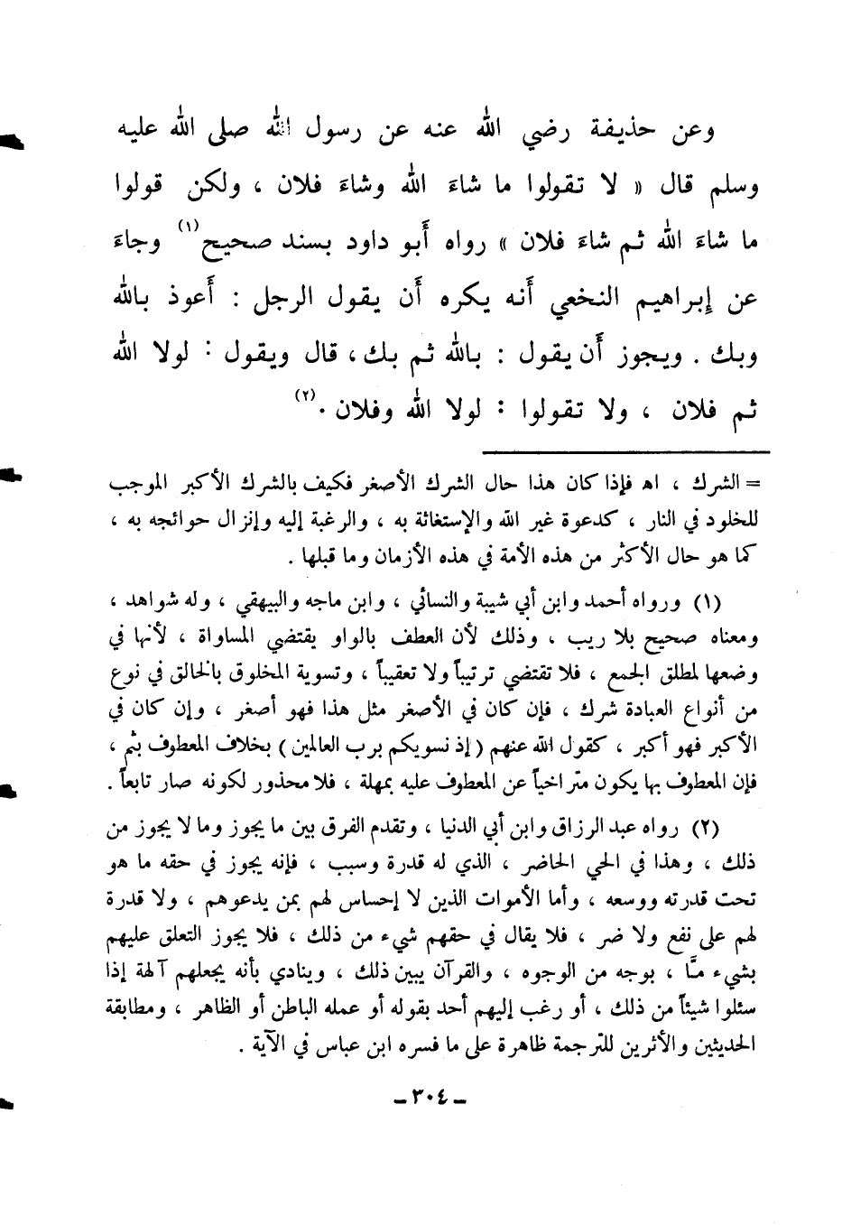 وعن حذيفة رضي الله عنه عن رسول الله صلى الله عليه وسلم قال " لا تقولوا ما شاء الله وشاء فلان، ولكن قولوا ما شاء الله ثم شاء فلان " 1 رواه أبو داود بسند صحيح (1) .