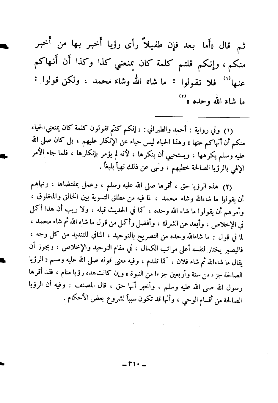 (1) وفي رواية أحمد والطبراني: " إنكم كنتم تقولون كلمة كان يمنعني الحياء منكم أن أنهاكم عنها " 1. وهذا الحياء ليس حياء عن الإنكار عليهم، بل كان صلى الله عليه وسلم يكرهها؛ ويستحيي أن ينكرها، لأنه لم يؤمر بإنكارها، فلما جاء الأمر الإلهي بالرؤيا الصالحة خطبهم، ونهى عن ذلك نهيا بليغا.