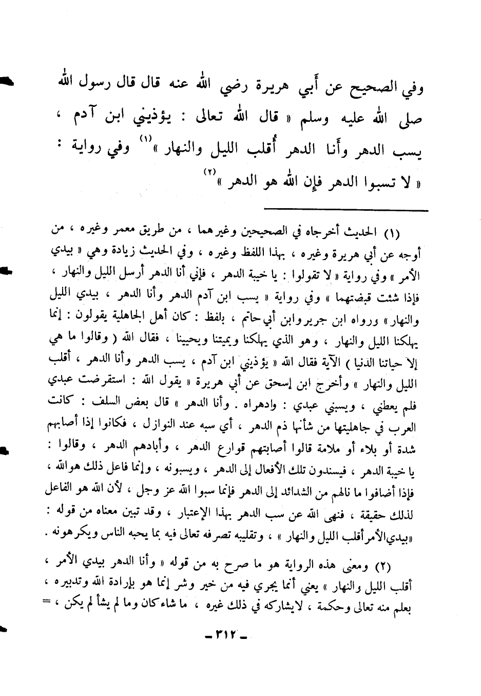 (1) الحديث أخرجاه في الصحيحين وغيرهما من طريق معمر وغيره من أوجه عن أبي هريرة وغيره، بهذا اللفظ وغيره، وفي الحديث زيادة وهي "بيدي الأمر" وفي رواية " لا تقولوا: يا خيبة الدهر؛ فإني أنا الدهر أرسل الليل والنهار، فإذا شئت قبضتهما " 3. وفي رواية: " يسب ابن آدم الدهر وأنا الدهر، بيدي الليل والنهار "4. ورواه ابن جرير وابن أبي حاتم بلفظ: كان أهل الجاهلية يقولون: إنما يهلكنا الليل والنهار، وهو الذي يهلكنا ويميتنا ويحيينا، فقال الله: {وَقَالُوا مَا هِيَ إِلاَّ حَيَاتُنَا الدُّنْيَا} 5 الآية. فقال الله: " يؤذيني ابن آدم، يسب الدهر، وأنا الدهر، أقلب الليل والنهار " 6 وأخرج ابن إسحاق عن أبي هريرة: " يقول الله: استقرضت عبدي فلم يعطني، ويسبني عبدي: وادهراه، وأنا الدهر " 7. قال بعض السلف: كانت العرب في جاهليتها من شأنها ذم الدهر، أي سبه عند النوازل، فكانوا إذا أصابهم شدة أو بلاء أو ملامة قالوا: أصابتهم قوارع الدهر، وأبادهم الدهر، وقالوا: يا خيبة الدهر، فيسندون تلك الأفعال إلى الدهر ويسبونه، وإنما فاعل ذلك هو الله، فإذا أضافوا ما نالهم من الشدائد إلى الدهر فإنما سبوا الله عز وجل؛ لأن الله هو الفاعل لذلك حقيقة، فنهى الله عن سب الدهر بهذا الاعتبار، وقد تبين معناه من قوله: "بيدي الأمر أقلب الليل والنهار". وتقليبه تصرفه تعالى فيه بما يحبه الناس ويكرهونه.