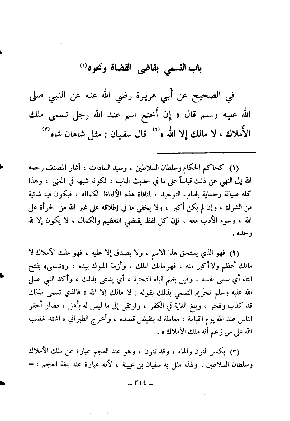 في الصحيح عن أبي هريرة رضي الله عنه عن النبي صلى الله عليه وسلم قال: " إن أخنع اسم عند الله رجل تسمى ملك الأملاك، لا مالك إلا الله (2) "1. قال سفيان: مثل شاهان شاه (3) .