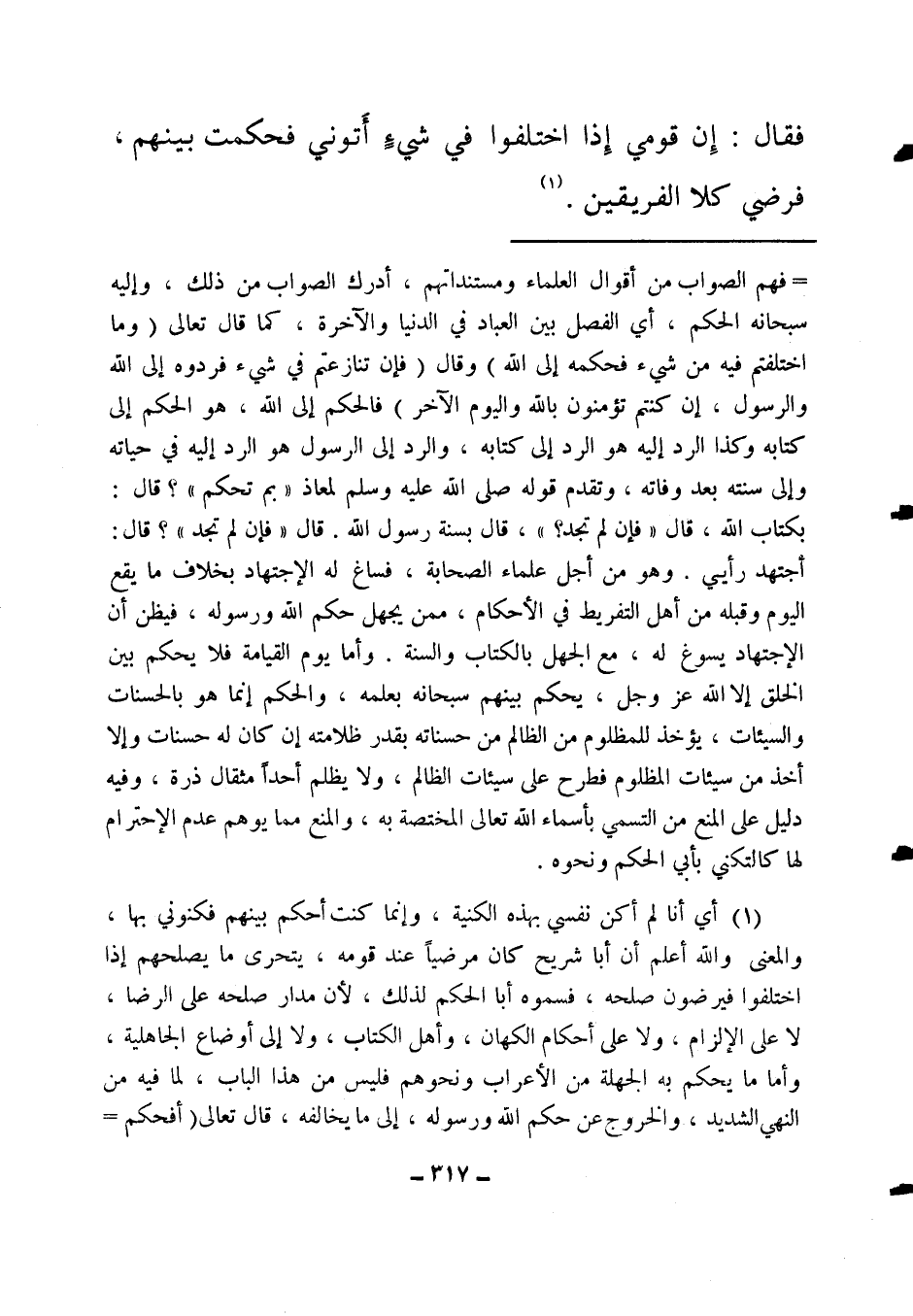 = فهم الصواب من أقوال العلماء ومستنداتهم، أدرك الصواب من ذلك. وإليه سبحانه الحكم، أي الفصل بين العباد في الدنيا والآخرة، كما قال تعالى: {وَمَا اخْتَلَفْتُمْ فِيهِ مِنْ شَيْءٍ فَحُكْمُهُ إِلَى اللَّهِ} 1، وقال: {فَإِنْ تَنَازَعْتُمْ فِي شَيْءٍ فَرُدُّوهُ إِلَى اللَّهِ وَالرَّسُولِ إِنْ كُنْتُمْ تُؤْمِنُونَ بِاللَّهِ وَالْيَوْمِ الآخِرِ} 2 فالحكم إلى الله، هو الحكم إلى كتابه وكذا الرد إليه هو الرد إلى كتابه، والرد إلى الرسول هو الرد إليه في حياته وإلى سنته بعد وفاته، وتقدم قوله صلى الله عليه وسلم لمعاذ: "بم تحكم"؟ قال: بكتاب الله، قال: "فإن لم تجد؟ "، قال: بسنة رسول الله. قال: "فإن لم تجد"؟ قال: أجتهد رأيي. وهو من أجل علماء الصحابة، فساغ له الاجتهاد بخلاف ما يقع اليوم وقبله من أهل التفريط في الأحكام، ممن يجهل حكم الله ورسوله، فيظن أن الاجتهاد يسوغ له، مع الجهل بالكتاب والسنة. وأما يوم القيامة فلا يحكم بين الخلق إلا الله عز وجل يحكم بينهم سبحانه بعلمه، والحكم إنما هو بالحسنات والسيئات، يؤخذ للمظلوم من الظالم من حسناته بقدر ظلامته إن كان له حسنات، وإلا أخذ من سيئات المظلوم فطرح على سيئات الظالم، ولا يظلم أحدا مثقال ذرة. وفيه دليل على المنع من التسمي بأسماء الله تعالى المختصة به، والمنع مما يوهم عدم الاحترام لها كالتكني بأبي الحكم ونحوه.