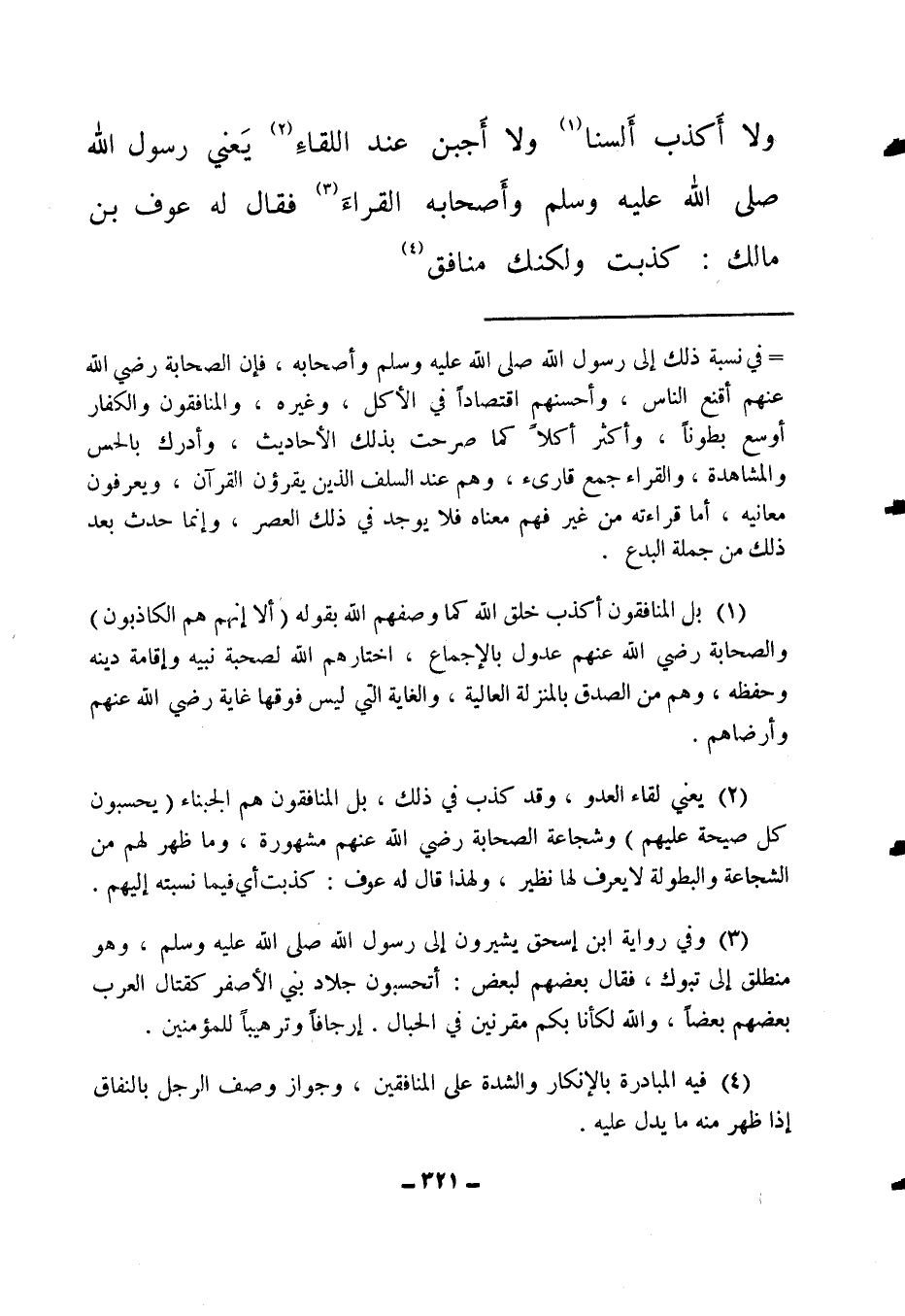 (2) يعني لقاء العدو، وقد كذب في ذلك، بل المنافقون هم الجبناء: {يَحْسَبُونَ كُلَّ صَيْحَةٍ عَلَيْهِمْ} 2، وشجاعة الصحابة رضي الله عنهم مشهورة، وما ظهر لهم من الشجاعة والبطولة لا يعرف لها نظير، ولهذا قال له عوف: كذبت أي فيما نسبته إليهم.
