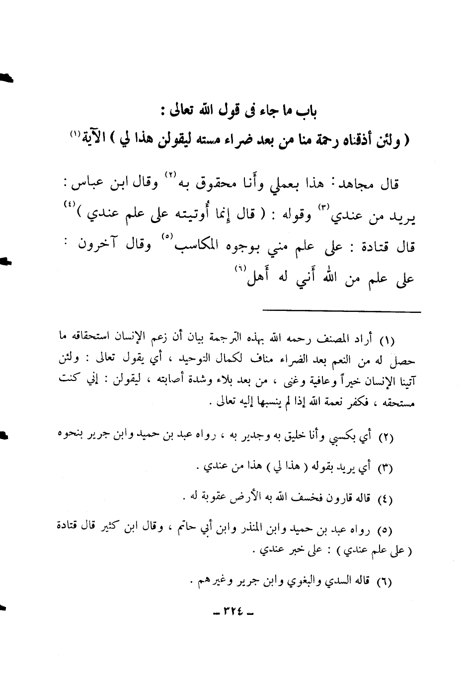 باب ما جاء في قول الله تعالى: {وَلَئِنْ أَذَقْنَاهُ رَحْمَةً مِنَّا مِنْ بَعْدِ ضَرَّاءَ مَسَّتْهُ لَيَقُولَنَّ هَذَا لِي} 1 الآية (1) .