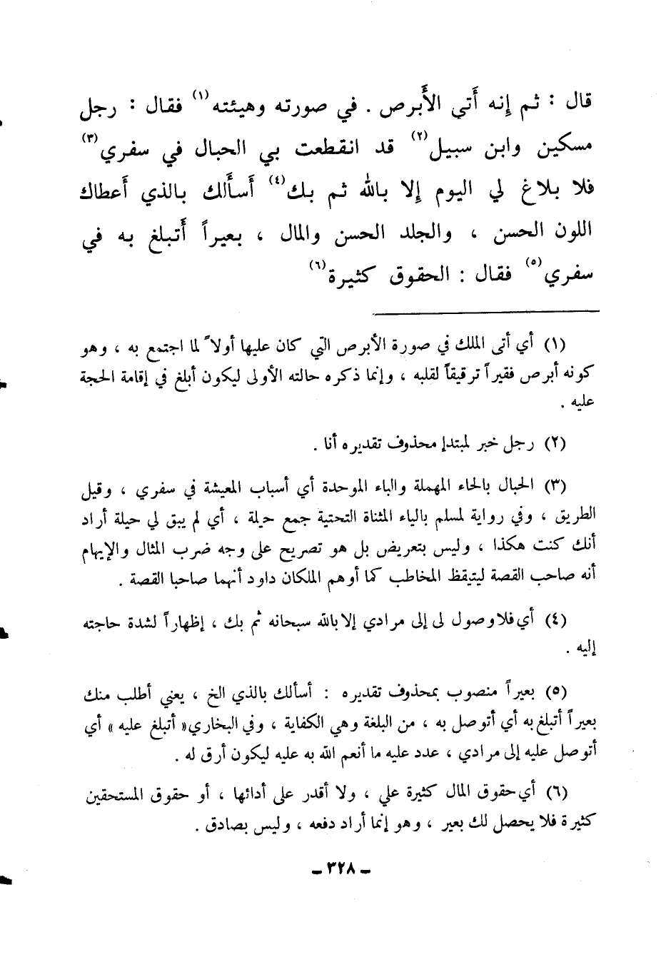 قال: ثم إنه أتى الأبرص في صورته وهيئته (1) ، فقال: رجل مسكين وابن سبيل (2) ، قد انقطعت بي الحبال في سفري (3) ، فلا بلاغ لي اليوم إلا بالله ثم بك (4) ، أسألك بالذي أعطاك اللون الحسن، والجلد الحسن والمال، بعيرا أتبلغ به في سفري (5) ، فقال: الحقوق كثيرة (6) .