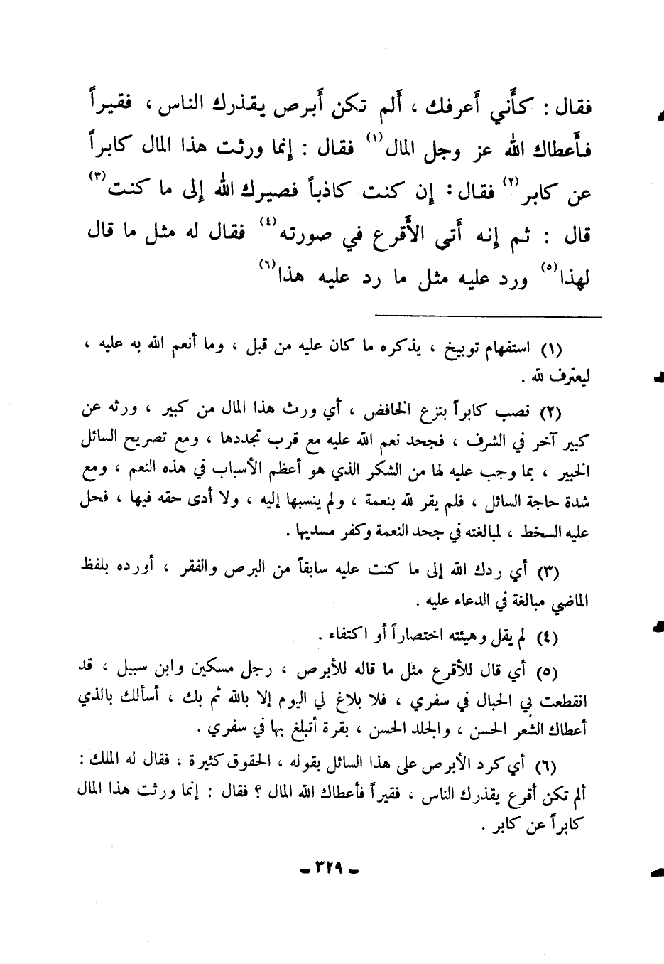 (6) أي كرد الأبرص على هذا السائل بقوله: الحقوق كثيرة، فقال له الملك: ألم تكن أقرع يقذرك الناس، فقيرا فأعطاك الله المال؟ فقال: إنما ورثت هذا المال كابرا عن كابر.