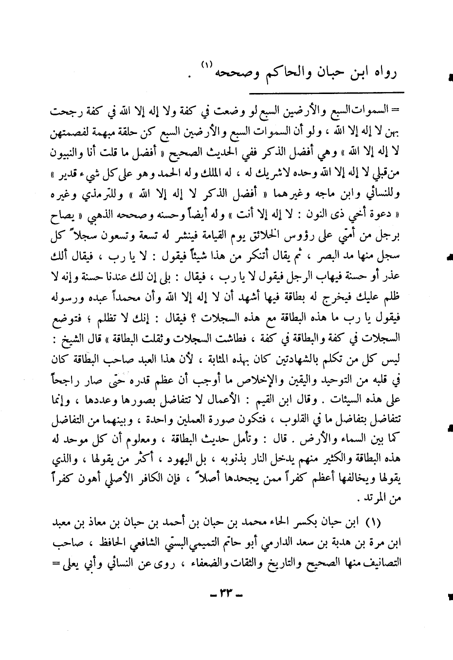 قال الشيخ: ((ليس كل من تكلم بالشهادتين كان بهذه المثابة؛ لأن هذا العبد صاحب البطاقة كان في قلبه من التوحيد واليقين والإخلاص ما أوجب أن عظم قدره حتى صار راجحا على هذه السيئات)) . وقال ابن القيم: ((والأعمال لا تتفاضل بصورها وعددها، وإنما تتفاضل بتفاضل ما في القلوب، فتكون صورة العملين واحدة، وبينهما من التفاضل كما بين السماء والأرض)) .